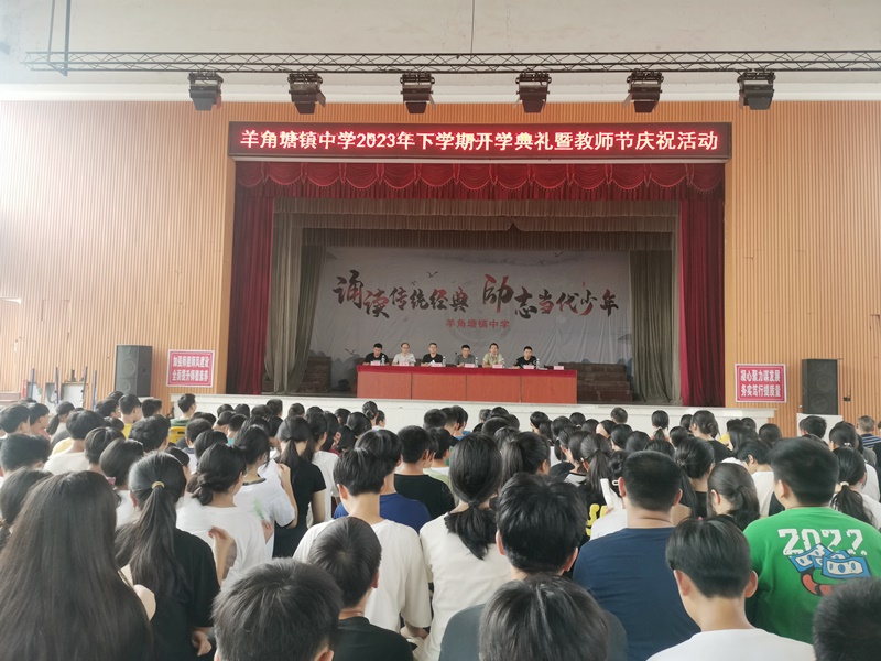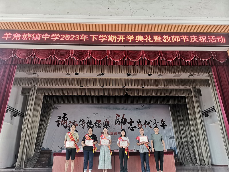 本网讯 9月8日上午,羊角塘镇中学组织全体师生欢聚风雨球场,隆重举行了2023年秋季新学期开学典礼暨第39个教师节表彰活动。 活动在激昂的国歌声中拉开序幕。首先,由该校办公室主任黎娟介绍学校新一届行政班子成员和14位新进老师,全体师生们热情洋溢,情绪激昂,欢呼声充满了整个会场。之后,教务主任杨武强作教学工作报告,回顾了上学期取得的教学成绩并总结道:来势较好,突破明显。并对本学期“狠抓基础过关,握住质量命脉”教学管理策略进行了详细解读,给全体师生明确了目标,指明了方向。政教主任卢双鹏在德育、政教工作总结汇报中,建议全体教师牢记立德树人根本任务,做到时时有德育,处处明纪律,人人重安全,个个会应急。随后,学生代表作教师节献辞,一句句情真意切的感恩之语表达了对老师的浓浓深情,感动着在场的每一位老师。在这温情的氛围中,杨武强宣读了2023年上学期师德标兵名单,并由该校党支部书记王日行为获得师德标兵的教师颁奖。 “师德标兵树典型,教书育人立榜样,希望老师们认真做好学生的引路人,人人争做‘四有’好老师,提前祝全体教师节日快乐。”王日行在活动最后说道。