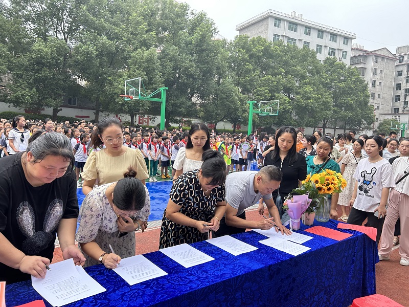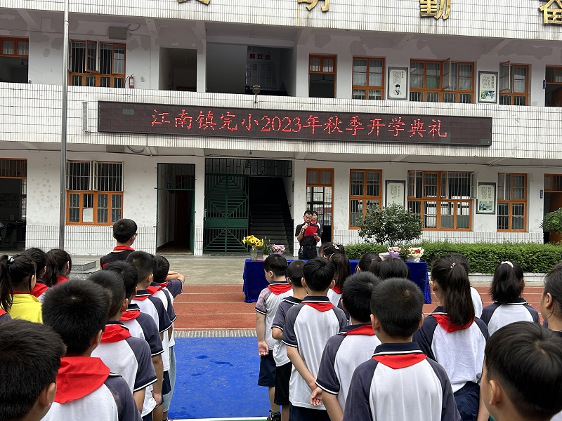 本网讯 9月7日,伴随着初秋温润的阵阵清风,江南镇完小全体师生齐聚绿茵场,隆重举行2023年秋季开学典礼。 开学典礼在庄严的国歌声中拉开序幕,全体师生齐唱国歌,面向国旗肃然而立,心中充满对新学期的奋斗激情与美好希冀。随后,校长贺剑伟带领全体教师在国旗下庄严宣誓,切实增强了教师们的责任感和使命感。副校长王立祥组织全体教师签订防性侵承诺书,强化教师责任与义务,织牢对学生的保护网。之后,贺剑伟为新学期致辞,他寄语全校师生要培养好学善思的习惯,坚持勤奋进取、持之以恒的精神,继承勤俭朴素的中华民族优良传统,在新学期收获感动、收获力量、收获成长。新教师代表和学生代表依次上台发言,表达了对新学期的期望和憧憬,树立了新学期目标。政教主任罗明亮对全体学生提出了几点希望和建议,学生们认真聆听,收获良多。最后,教务主任邱羽晨对上学期优秀学生获奖名单进行宣读,隆重表彰了上学期在学习和期末检测中表现优异的同学。至此,开学典礼在热烈的掌声中圆满结束。 开学典礼开启梦想新篇章,江南镇完小全体师生正脚踏实地,追风赶月,共创美好未来。