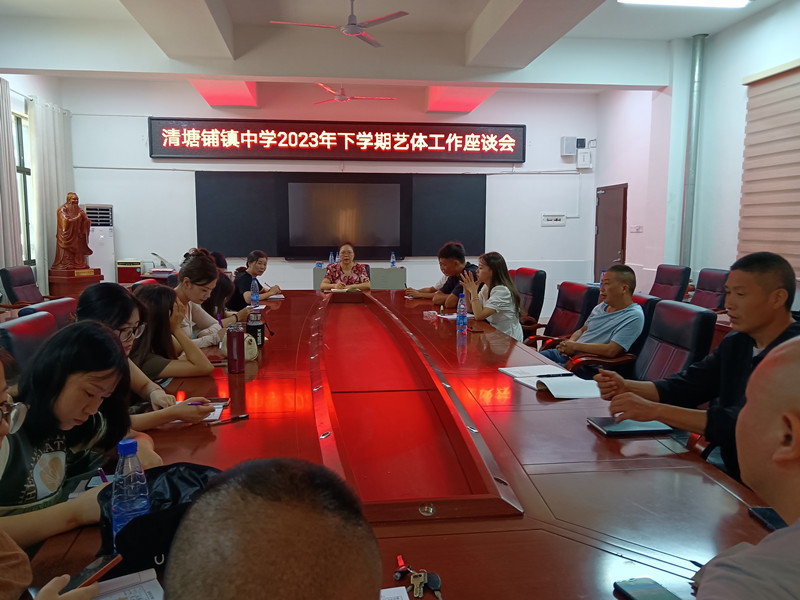 本网讯 8月31日上午,清塘铺镇中学在学校小会议室召开新学期艺体工作会议,校长刘丽莉主持,全体行政人员、艺体组教师参加会议。 艺体教师就本学科的学期计划与设想作了汇报,并提出了许多专业方面的建议或意见。教导处主任陈艳梅充分肯定了上学期艺体组所取得的成绩,并部署了本学期两操、代表队训练、课后服务、少年宫社团等工作。刘丽莉指出,艺体组教师要抓好常规教研,及时关注课堂教学效果与各级各部门组织的比赛,落实“双减”政策,做到“五育并举”,促进学生全面发展;要以县运会为契机,以校运会、元旦文艺汇演为推力,丰富学生课余生活,给学生提供展示才能的舞台;要群策群力,狠抓特长生培训工作,使学校艺体工作再上新台阶。
