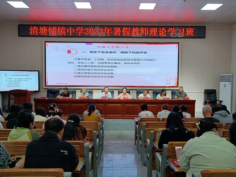 本网讯 8月28日上午,清塘铺镇中学在学校多功能报告厅召开2023年秋季开学工作暨师德师风培训会议。全体教职工参加,中心校党建办主任邓朝阳应邀出席,会议由办公室主任张剑文主持。 校长刘丽莉作了题为《悦享教育,优雅人生》的学校工作报告,报告分两个部分。她从五个方面回顾上学期工作,在肯定成绩的同时,也指出了学校发展所面临的困境;她以“牢守安全底线,明确质量生命线,狠抓队伍建设、学生培养、常规管理三个重点”展望新学期工作。她要求全体教职工齐心协力,以饱满的热情、务实的作风,为推进学校内涵发展、提升办学品位、打造办学特色而努力。 随后,工会主席周伟宏组织学习了《清塘铺镇中心学校作风建设和师德师风建设双十规定》《清塘铺镇中心学校作风建设和师德师风建设再敲警钟、再念紧箍咒》等文件。政教处主任刘轩尚就防溺水、防电信网络诈骗、安保维稳、隐患排查、学生管理等相关工作进行了强调。 据悉,此次理论学习班将持续三天,届时每位老师都会上交心得体会与责任状。