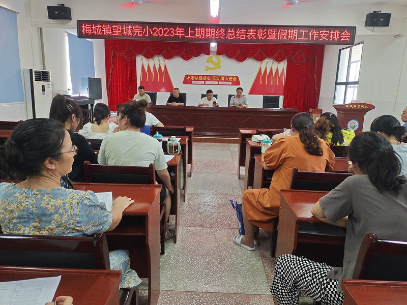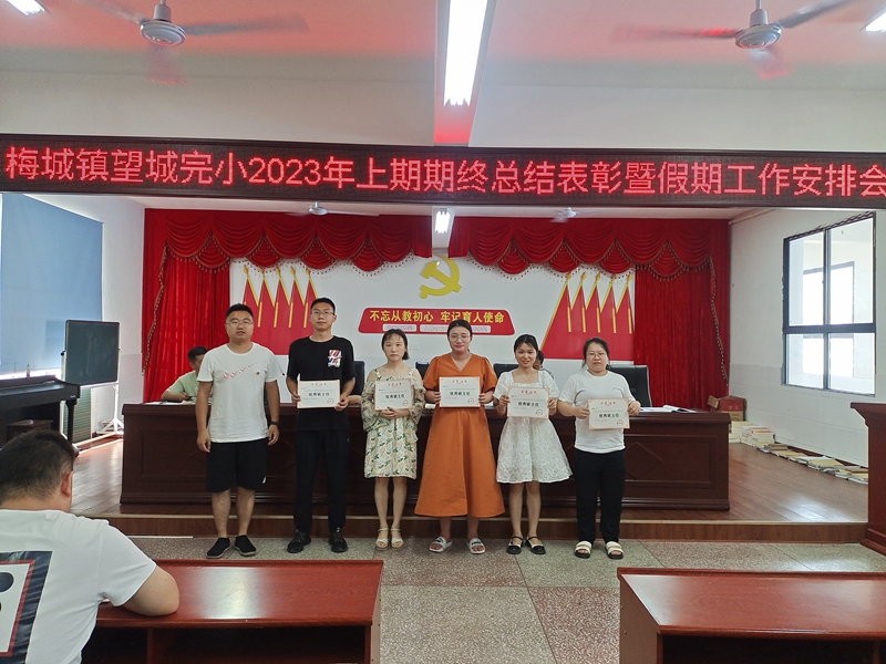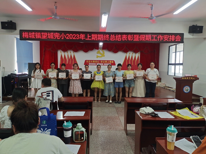 本网讯 7月3日,梅城镇望城完小举行2023年上期期终总结表彰暨暑假工作安排会。 校长李兴家总结本学期工作和取得成绩,全校教职员工同心同德,围绕学校学期工作重点,创新管理机制、丰富校园文化、充实教研活动、狠抓习惯养成。各项活动开展得有声有色,达到理想的教育教学效果,取得不错的反响。本学期全体教职工立足本职,脚踏实地,迎接新挑战,争取新突破,为学校的发展做出积极贡献。他提醒老师们,在看到成绩的同时,更需要冷静反思:学校的管理还要更加扎实、精细;老师们的教育观念、教学方式方法等方面还需要认识和提高。他表示,学校对老师们的关爱还是不够的,将继续努力,为老师们营造家的感觉。 教导主任董鸿亮宣读表彰通报,何倩等11名教师被评为常规工作先进个人,谌佩瑛等6名教师被评为优秀班主任。学校领导为本学期涌现出的先进教职员工颁发证书,予以表彰和鼓励。