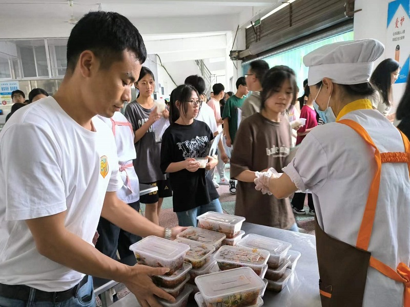 本网讯 “小炒牛肉、回锅肉、火腿肠和鸡蛋,好丰富的营养午餐哟!”6月14日中午,安化县江英高级中学320多名高一学生在“考点”领取了学校后勤部门送来的热腾腾的“学考营养餐”,个个兴奋不已,人人盈满了幸福的笑容。 据了解,为搞好学考学生的后勤保障工作,确保孩子们的身体健康,学校后勤部门早行动、早安排、早动手,精心准备了各种营养物品和食材,购买了卫生饭盒,并动员后勤人员充当好志愿服务者。他们中有的还走进学生公寓,挨个宿舍鼓劲加油,逐一检查文具证件、叮嘱细节。 “取个好彩头哟!”后勤人员将备用品送到考区,从进场守护到开考15分钟,随时准备应对突发状况。他们将“学考营养餐”用保温桶装着,小心翼翼地运送到孩子们休息的地方,一一在门厅内为学考学生分发,孩子们吃得津津有味,个个激动不已。 “学考只是开始,更重要的是往后的高考。到那时,我们将会有更多更好的消息频频而至,今天的320多份‘学考营养餐’将不负韶华!”2201班学生夏至伟盯着手上的“学考营养餐”很是感慨。