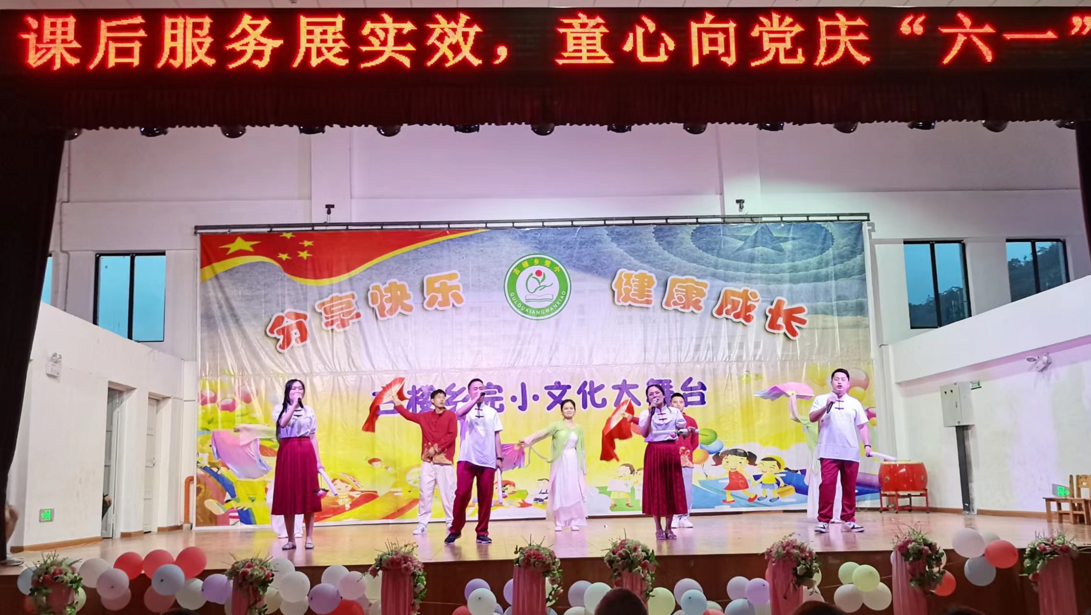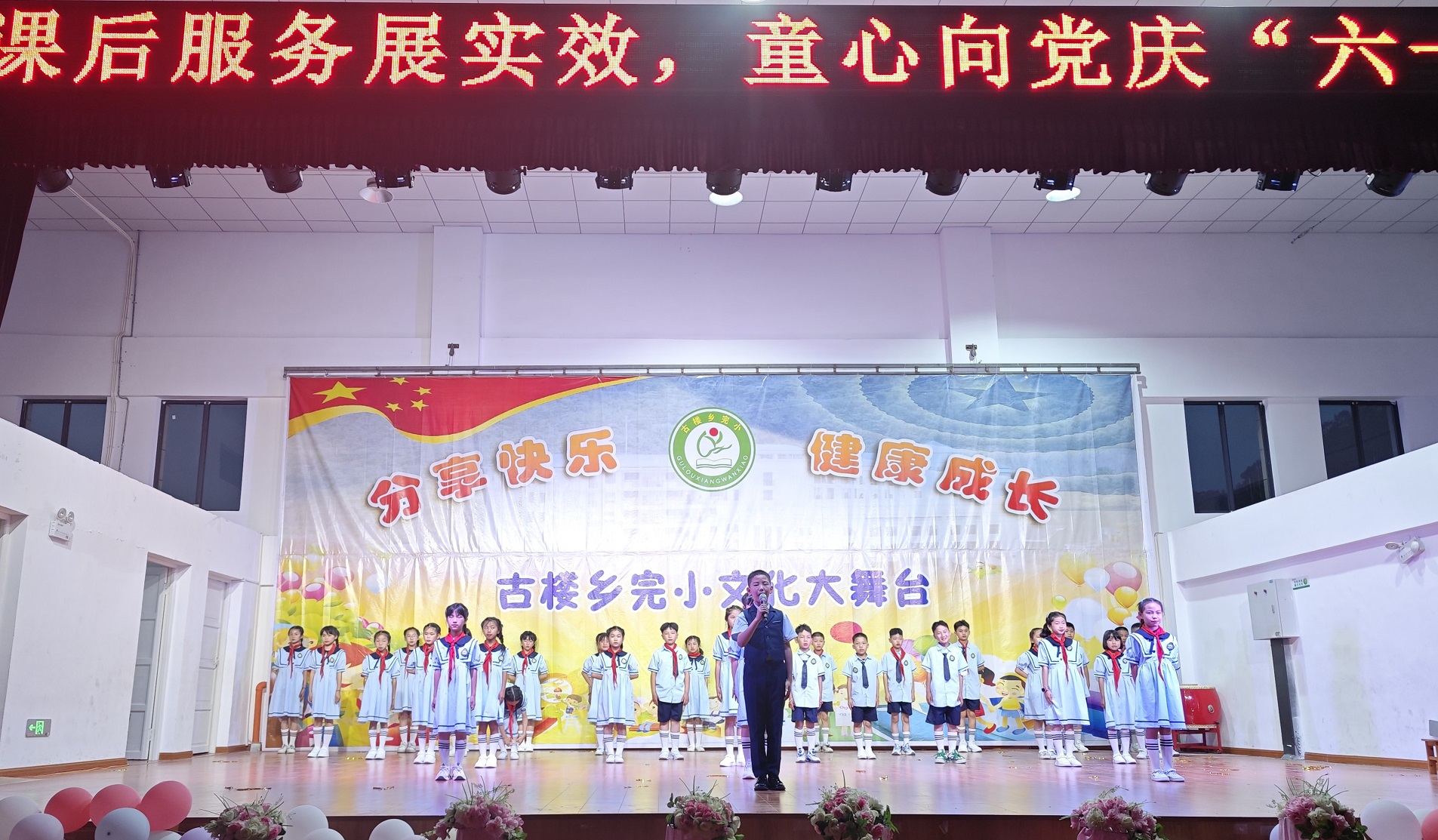 本网讯 6月1日,古楼乡完小举行以“课后服务展实效,童心向党庆六一”为主题的儿童节文艺晚会。全体师生和家长代表一同观看演出。 该晚会分为三个篇章。第一篇章“师者,有追求”教师们以舞蹈、歌唱、现场互动游戏等节目形式,展现教师积极向上的精神风貌,和共建快乐、和谐的校园的美好愿望;第二篇章“我运动,我快乐”,有篮球、健美操等多个运动类节目,展示古楼完小学子阳光、自信、向上的精神风貌;第三篇章“展才艺,同庆祝”中,以歌唱、手势舞、杯子舞等形式,充分展现古楼完小学子的艺术才华。 整场晚会节目精彩纷呈,赢得了现场观众的热烈掌声和阵阵喝彩。