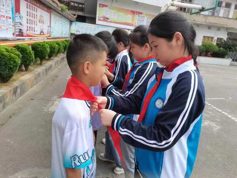 在入队仪式上,胡丽娜宣读新中队和新队员名单,五六年级各班优秀学生代表为新队员佩戴红领巾,该校校长杨力隆为新成立的中队授予中队旗。在大队干部姚幸滔的带领下,新少先队员举起右手,面对国旗,庄严宣誓,六年级一班姚倩同学作为优秀少先队员代表发言,承诺以后勤奋努力、积极进取,争做同学们学习的榜样。教导主任方晓平提出新的希望和要求,激励全体少先队员争做新时代优秀少年。