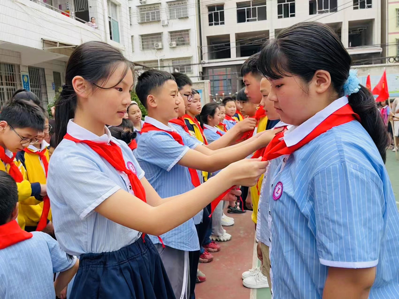 在铿锵有力的出旗曲中仪式拉开序幕,新队员们用炽热的目光迎接这光荣的时刻。仪式上,老队员为新队员戴上鲜艳的红领巾,他们个个精神饱满、神情庄重,满怀着对中国少年先锋队的期待和向往。