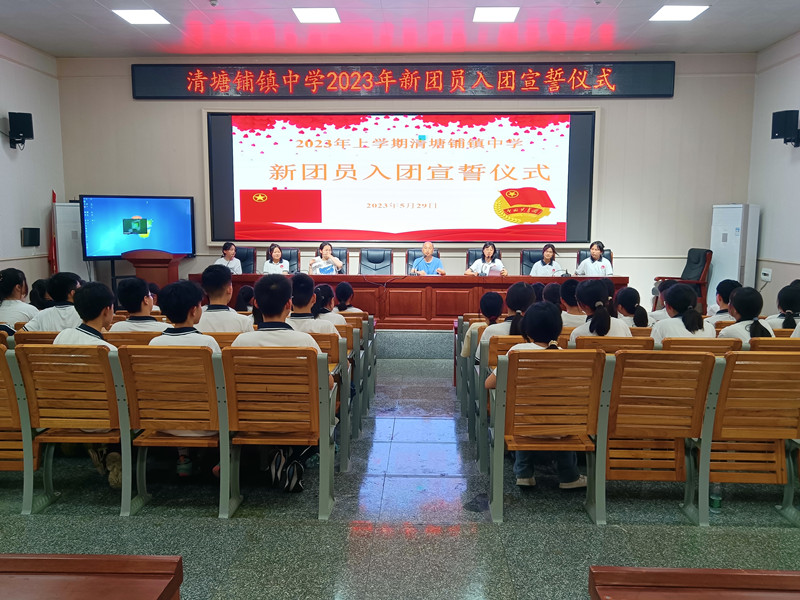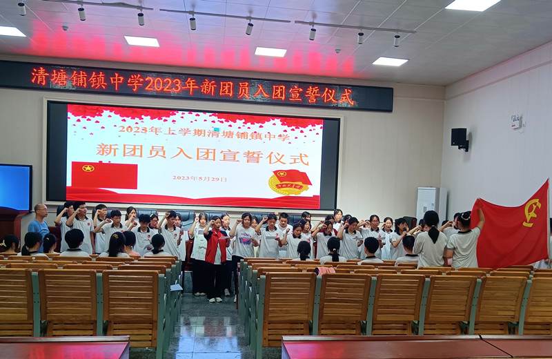 本网讯 5月29日,清塘铺镇中学团委在学校多功能报告厅举行2023年新团员入团宣誓仪式。各班团支书、新团员、老团员及入团积极分子代表共70余人参加。 仪式在嘹亮的团歌声中拉开帷幕。团委张剑文老师宣读新团员名单,老团员一一给新加入的同学授予团证,佩戴上庄严而又神圣的团徽。在主持人刘雅琪的带领下,全体新团员面对鲜艳的团旗,举起右手进行宣誓,铿锵有力的誓言,展现他们成为共青团员的自豪感和勇往直前的决心。 张剑文向各位新团员表示热烈的祝贺和诚挚的欢迎。他指出,青年团员要有坚定理想信念,做到听党话、永远跟党走,传承红色基因,发扬艰苦奋斗的优良传统;要德才兼备,做到严格遵守校纪校规,认真履行团的义务,时时刻刻起模范带头作用。他鼓励全体青年团员从一点一滴做起,从每分每秒做起,不断修炼自身,完善自我,牢记使命,勇于担当,以实际行动践行自己的入团誓言。