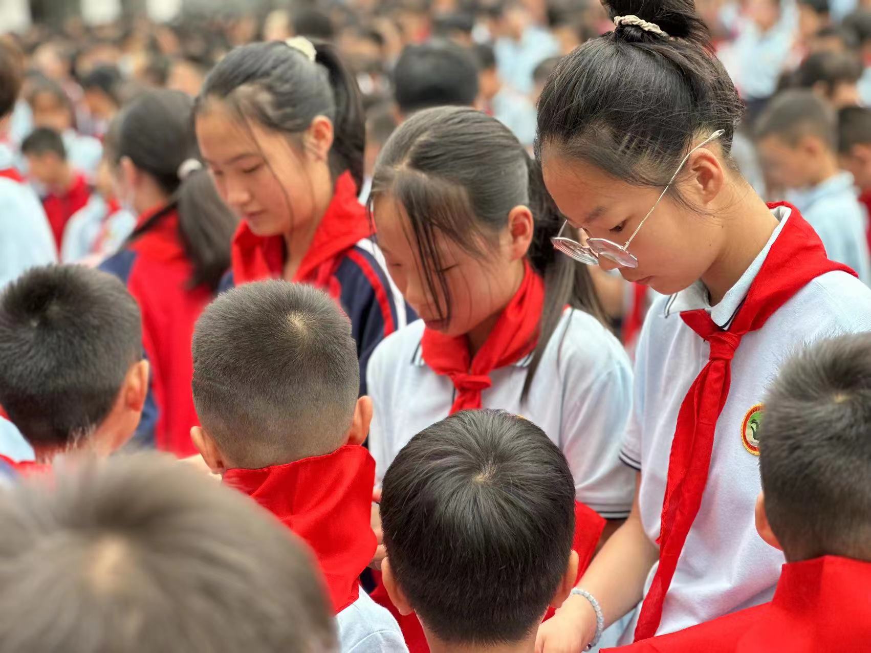 本网讯 5月29日,大福镇完小举行2023年新队员入队仪式。 伴随着激昂的出旗曲,旗手们迈着铿锵有力的步伐入场,入队仪式正式拉开序幕。入队仪式上全体少先们高唱队歌。高年级的老队员们一起为新队员们系上红领巾,新队员的脸上洋溢着开心灿烂的笑容。在老队员的带领下,少先队员们郑重地举起右拳,庄严宣誓。新队员代表田瑾瑜代表所有新队员表达了加入中国少年先锋队的激动之情,并表示一定会更加努力,用自己的行动让红领巾更红,让队旗更亮。 学校党支部书记林颖向新入队的少先队员们表示热烈的祝贺,希望新老队员们在学习生活中,勇敢地担负起新时代的重托,把自己锻炼成为“做人自信,做事诚信,怀揣民族信仰”的社会主义建设者和接班人,让自己成为新时代祖国建设的栋梁之材。