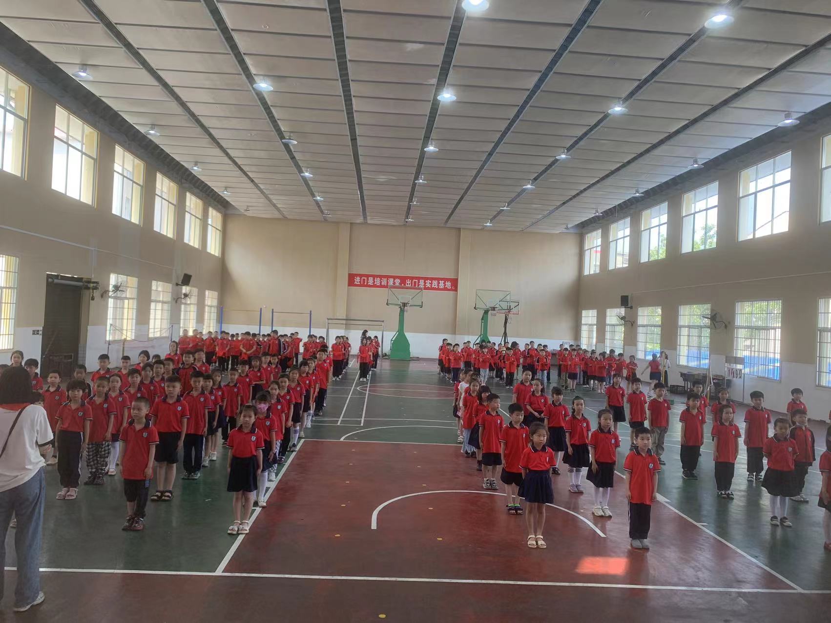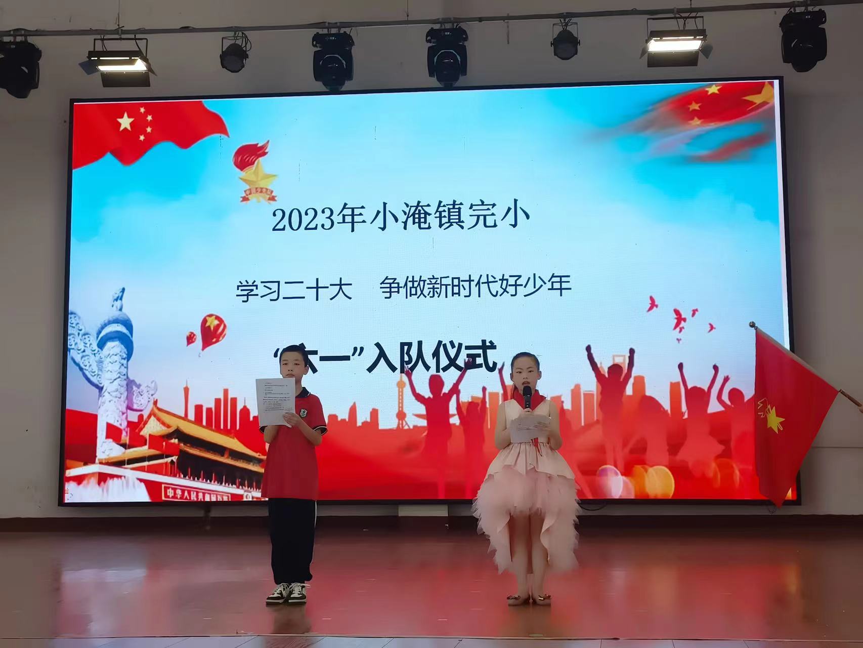 本网讯 5月29日上午,小淹镇完小少先队大队部在风雨球场举行新队员入队仪式。本次活动主要为一、二年级入队。 在入队前,一年级的小朋友就时刻准备着,少先队大队部认真组织开展队前教育活动,小队员们认真学习少先队知识,积极上交了入队申请书。 仪式现场,伴随着激昂的出旗曲,少先队旗手和护旗手迈着整齐的步伐进入会场,队旗飘扬。鼓乐队的同学们齐齐上阵庆祝新队员们入队,全体队员高唱《中国少年先锋队队歌》,嘹亮的歌声在校园内回响。党员教师带头和老队员一起为142名预备队员佩戴红领巾。 大队辅导员卢进为一年级新中队授队旗,一面旗帜,一份使命,队员们将在少先队组织中完善自我,勇攀高峰。卢进代表少先队大队部向新入队少先队员致辞,并提出希望和要求。