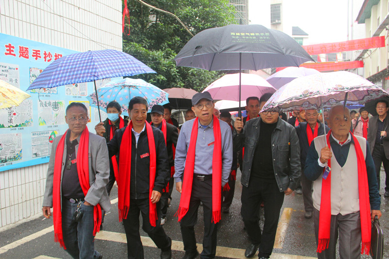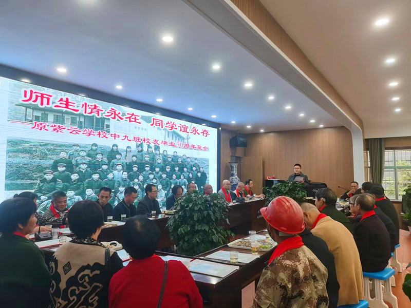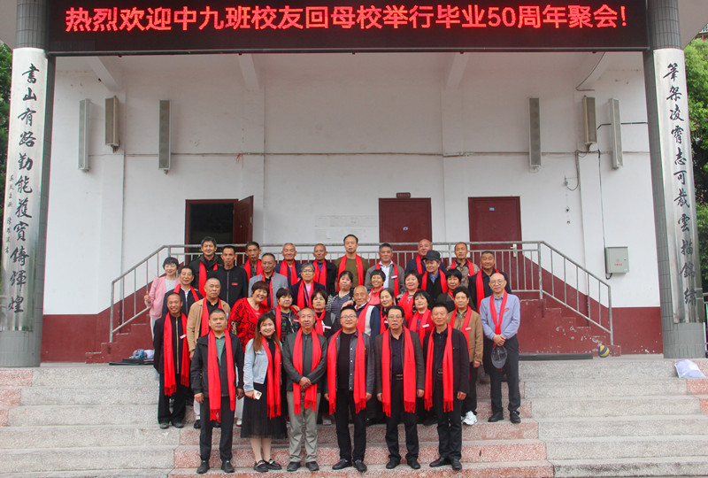 本网讯 5月23日,原紫云学校(现梅城镇中学)中九班校友毕业50年后,重回母校聚会,追忆激情青春岁月。学校党支部书记、校长喻选民带领部分老师热情接待并全程参与活动。 在座谈会上,喻选民代表学校对校友们的到来表示诚挚的欢迎,回顾学校的历史沿革,介绍近年来在教育教学、课程建设等方面取得的巨大成绩与发展前景。喻选民表示,在各位校友的关注与支持下,学校有决心、有信心再创辉煌,母校永远以大家为荣! 原班主任老师李灼宇代表全体校友,感谢学校对校友们的关心及盛情款待,表示看到学校日新月异的发展变化后,校友们内心充满了骄傲与自豪。在李老的述说中,曾经的校园时光一幕幕闪过眼前,时间没有淡去这成长摇篮的记忆,大家听着久违的声音,看着久违的面庞,一幅幅学习生活画卷从脑海深处缓缓展开。随后,校友代表皮放鸣、黄浩云、龙灿辉相继发言,表达对母校精心培养的感谢之情,回忆在母校学习的青葱岁月,畅谈重返母校的无限感怀,共叙师生、同窗深厚情谊,分享打拼事业的艰难历程与成功喜悦…… 全体同学向母校立石捐赠并合影留念,以表达对母校的感恩和怀念之情。