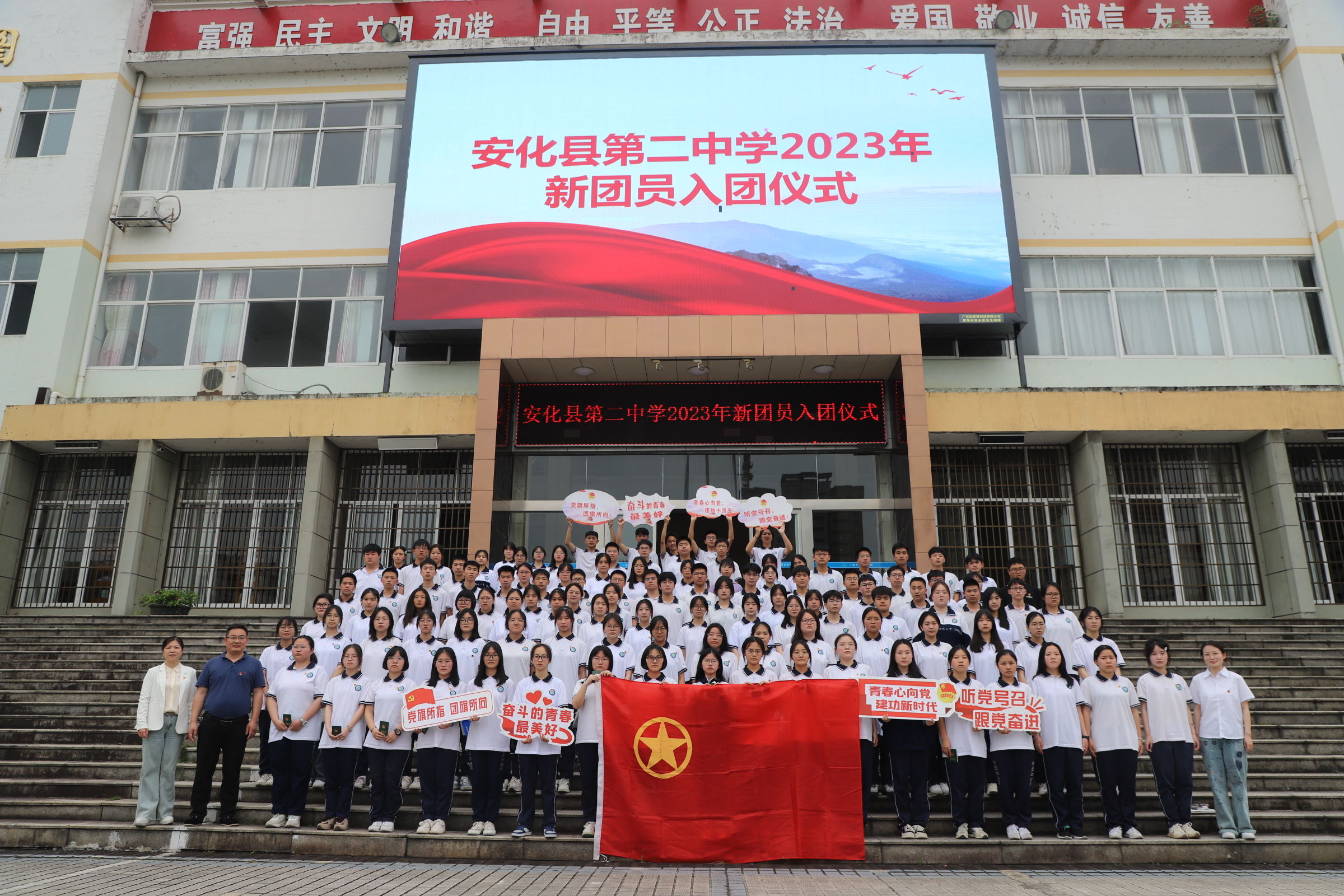 本网讯 5月15日,安化二中举行以“学习党的二十大,奋进新征程”为主题的2023年新团员入团仪式。学校党委委员、副校长李寨,团委书记刘少玲,部分青年教师,学生团干等参加活动,见证90名优秀学子光荣入团。 活动中,党员同志、青年教师、学生团干为新入团的90名同学颁发团员证书、佩戴团徽。“我志愿加入中国共产主义青年团,坚决拥护中国共产党的领导……”面对鲜艳的团旗,新团员庄严宣誓,老团员重温入团誓词。随后,学生团干带领新老团员读《团章》,学党史,深入了解团员的权利义务和光荣使命。 李寨向新团员表示祝贺,并希望新老团员明确责任与担当,坚定使命和信心,牢记党的助手和后备军的身份,不断加强学习,提升修养能力。