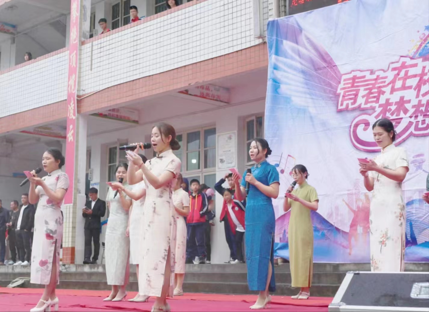 本网讯 5月8日,龙塘镇中学“飞扬青春,多彩多艺”主题艺术节正在举行。 副校长黄小芳致开幕词后,六一班班主任黄思奥老师激情演唱五月天的《倔强》,拉开了艺术节的帷幕。整场演出共24个节目,形式多样,舞蹈、歌曲、诗朗诵、小品、古筝、体操、水墨画以及京剧脸谱展示等。欢快的舞蹈、精湛的演技、嘹亮的歌声、尽情地展示了全校师生们热情奔放,充分展现了龙中学子多才多艺,青春飞扬的新时代精神面貌。以校长雷科为首的教师T台秀,更是将整个活动推向了高潮。校长雷科的一身笔挺精神的西装与女老师们的一袭曼妙多姿的旗袍。刚柔并济,独具韵味。 本次艺术节的奖品更是别出心裁,选用学生的美术作品作为帆布包的花纹图案。既展示了学生的才华,更是告诉同学们要学会用艺术来美化生活。