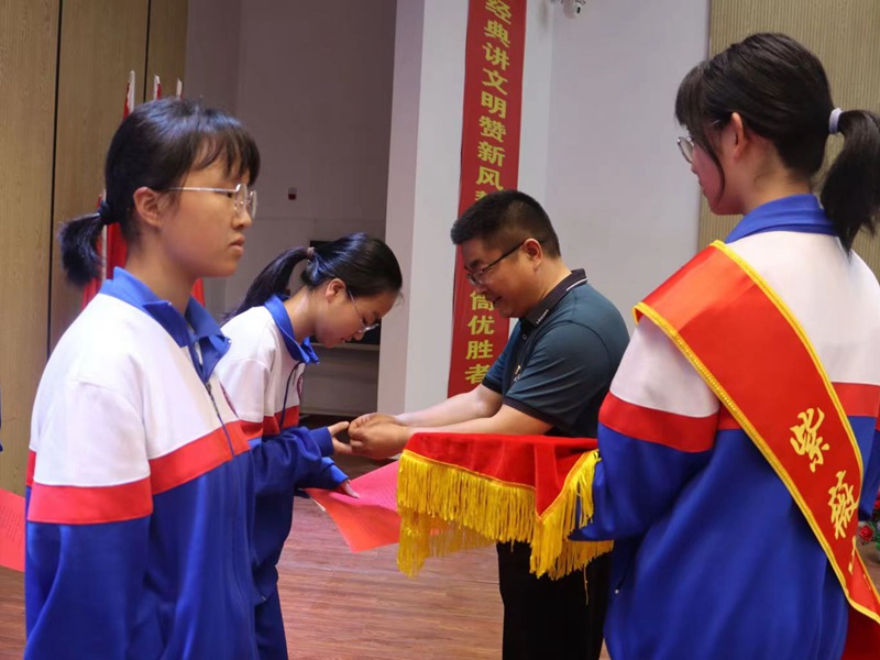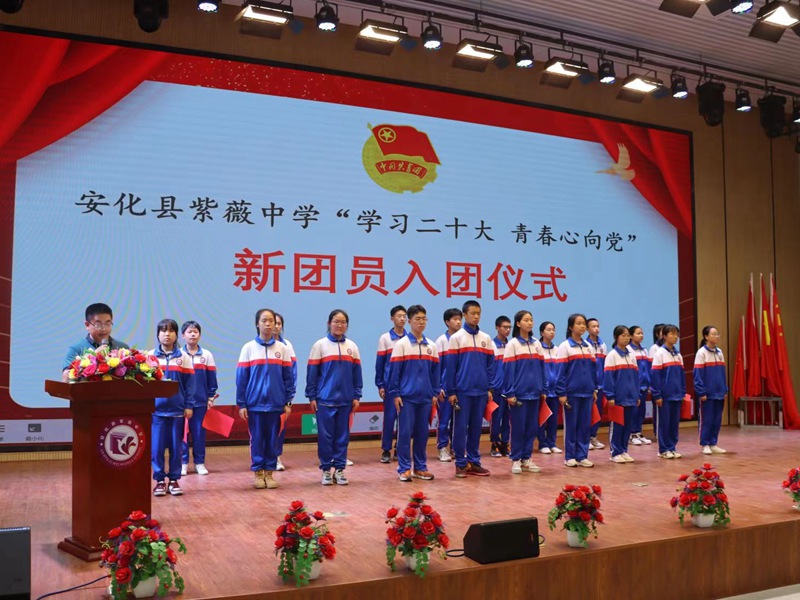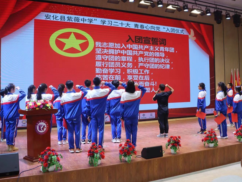 本网讯 5月5日,安化县紫薇中学八年级全体学生齐聚学校多功能报告厅,举行2023年上学期“学习党的二十大 青春心向党”退队、入团、十四周岁集体生日仪式。 仪式在庄严的少先队出旗曲中拉开帷幕,八年级同学出队旗、唱队歌、最后一次行少先队队礼。师生齐唱《生日快乐》歌,共同庆祝十四周岁生日,迈入人生新阶段。同学们将队徽小心翼翼地放入口袋、仔细珍藏,以此告别童年,跨入青年。 “以青春之我,创建青春之家庭,青春之国家,青春之民族,青春之人类,青春之地球……”铿锵的气势,坚定的话语,诵出了同学们绚烂的青春理想。站在青春的起跑线上,经过学生推选、班主任推荐、团委考察等环节,本次有20位同学光荣地加入了中国共产主义青年团,他们面对团旗高举右拳,庄严宣誓“为共产主义事业而奋斗”。 校长曹文武寄语青春,他表示,青年是朝气蓬勃,是活力无限,是祖国最灿烂的明天。作为新时代的中国青年,一定要敢于有梦、勇于追梦,一定要严以修身、勤以治学,真正做一个能担重任的好青年。