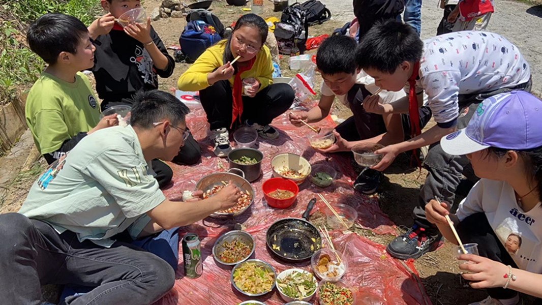 本网讯 4月26日,一群快乐的学生正在路边上高唱红歌,原来是高明乡塘坳完小正在进行社会实践活动--野炊,他们的目的地是美丽的瓦子寨。 经过一个小时的步行,学生们到瓦子寨。孩子们就兴致勃勃地开始布置野炊场地,搭灶、提水、捡柴、洗菜......大家分工合作,忙得热火朝天。时而有学生喊道:“火灭了,快来帮忙”;时而会有学生叫道:“哇,好烫”;甚至有人在埋怨:“你怎么不帮我扶住锅子,菜全倒地上了”。看似混乱的场面,却一点儿都不妨碍学生们高兴的心情。 经过师生的合作,煎蛋、莴笋炒肉、黄瓜火腿......各位食物纷纷出锅,大家围坐在一起,你一口,我一筷,分享彼此的劳动成果。