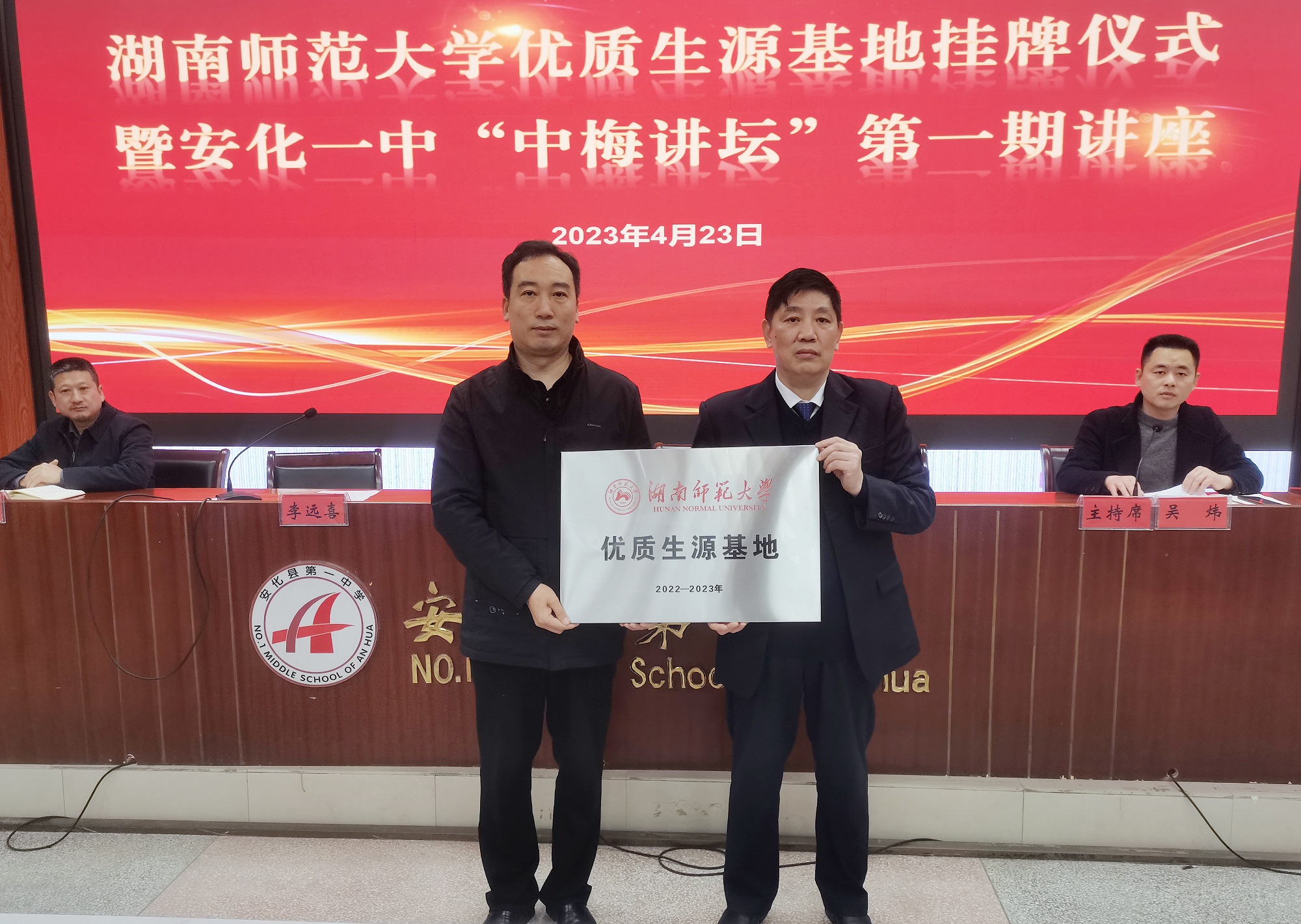 本网讯 4月24日,湖南师范大学“优质生源基地”挂牌仪式暨安化一中“中梅讲坛”第一期讲座活动在培英楼多功能报告厅举行。湖南师范大学化学化工学院院长、博士生导师杨荣华,湖南师范大学化学化工学院党委副书记段婷参会。活动由安化一中党委委员、副校长吴炜主持。