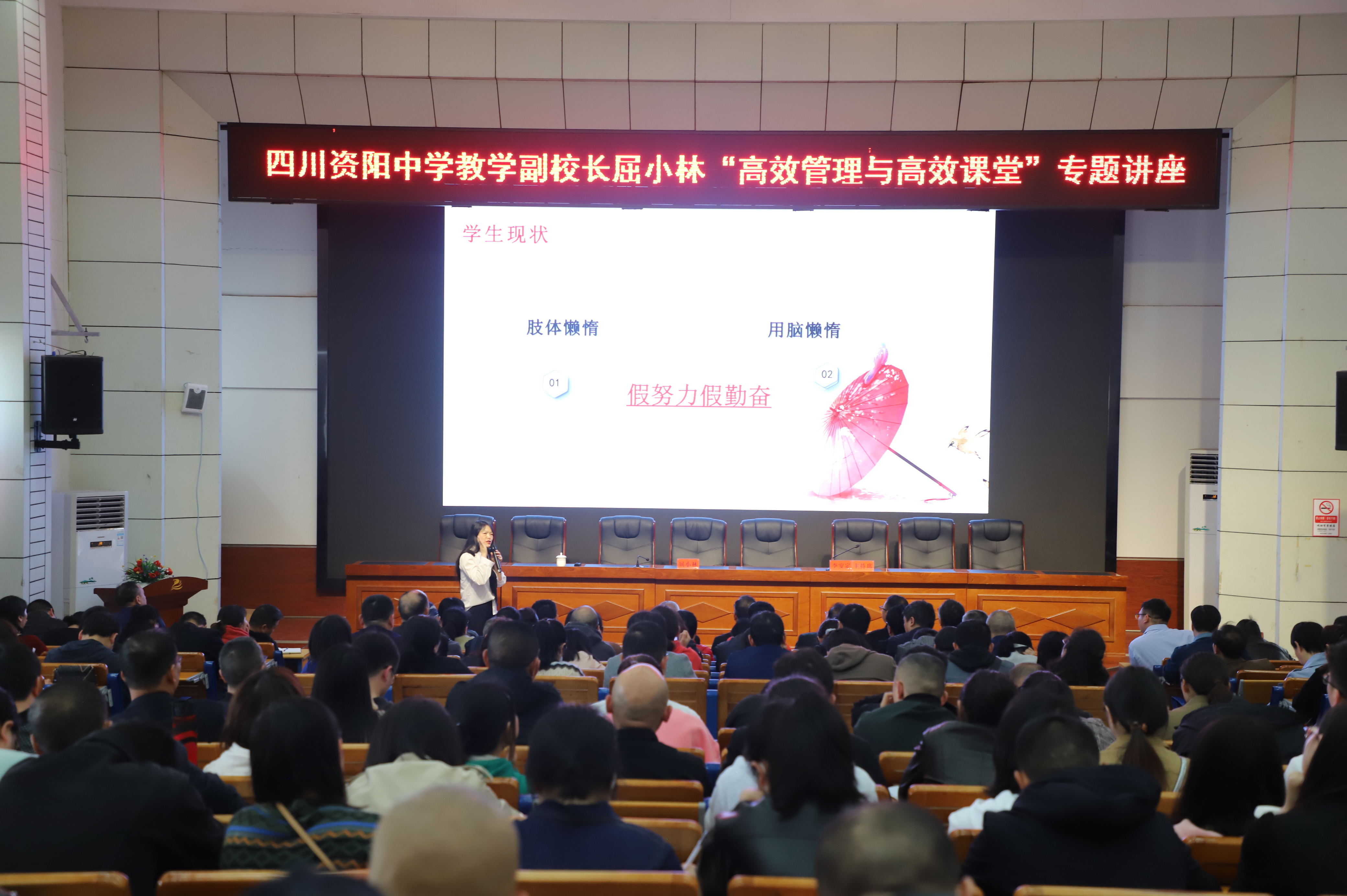 本网讯 4月10日,四川省课程改革专家组成员、四川省资阳中学教学副校长屈小林应邀到安化二中作“高效管理与高效课堂”专题讲座。安化二中全体教学人员听取讲座,党委委员、副校长李安定主持讲座。 屈小林的讲座求真务实、注重细节、强调高效,为课堂提质增效提供了切实可行的思路。他指出,感知幸福的能力是打造高效课堂的前提,教师要做有灵魂的教育者,要保持教育初心,肩负教育使命,在传授知识的同时向学生传递幸福;学生的学习能力是实现高效课堂的核心,教师要学会把握问题导向,激发学生内在潜力,抓实细节落实规范,从而促进学生高效学习;顺时而变的教学方式是成就高效课堂的保障,教师要从教学现状及“三新”带来的挑战背景出发,分析现有教学方式的不足,更加注重学生的全面发展。 参会教师纷纷表示,今后将积极运用所学方法,抓实细节,落实规范,稳步推进高效课堂的建设。