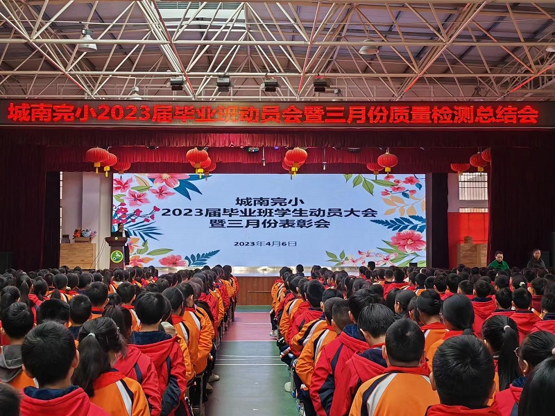 本网讯 4月6日下午,城南完小在风雨球场举行毕业班学生动员大会。会议由教导处副主任谌晴如主持,学校行政、全体六年级师生近500人参加大会。 该校教务主任刘静作题为《春暖花开日,奋斗正当时》的动员报告,就该校六年级学习现状进行了全面解读,并要求学生要用功读书,端正态度,勤奋努力,合理安排好学习时间,掌握学习方法。会上,教师和学生代表分别作了激励斗志、催人奋进的发言。副校长谌朝晖做了题为《数字符号,字里行间恩师情;粉笔板擦,一举一动记心间》的总结讲话。饱含着对同学们的肯定与赞扬、鼓励与厚望,希望学生们树立明确的学习目标,勤奋好学,听从老师的教诲,做一名优秀的小学毕业生。 活动在六年级孩子集体宣誓中结束。