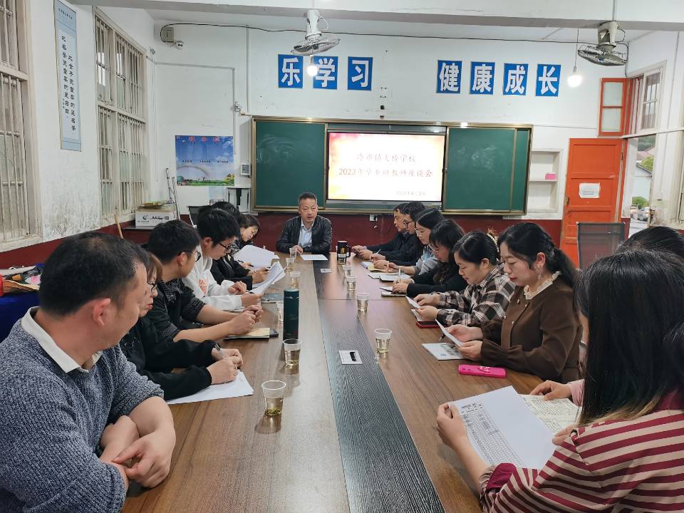 本网讯 4月3日晚,冷市镇大桥学校组织九年级任课教师,八年级班主任,生物、地理教师、校务人员召开毕业班复习备考工作专题会。共商中考大计,鼓劲加油,争创佳绩。 会上,班主任根据各班实际分析了学生思想动态、学情,心理健康情况。任课教师代表结合学科特点陈述了复习备考安排,表明攻坚克难勇毅前行的坚强决心。教务处负责人通报了前段模拟考试情况,提出了补齐薄弱学科短板的措施,解读了中招报名、理化生实验操作考试、体育考试、信息技术考试相关工作的注意事项。 校长黄军指出,中考倒计时牌,记录了毕业班师生的艰辛付出,教室里冲刺中考的紧张氛围,彰显了开弓没有回头箭的勇气。唯有不负家长重托和组织期望,心往一处想,拧成一股绳,向着既定目标,撸起袖子加油干。
