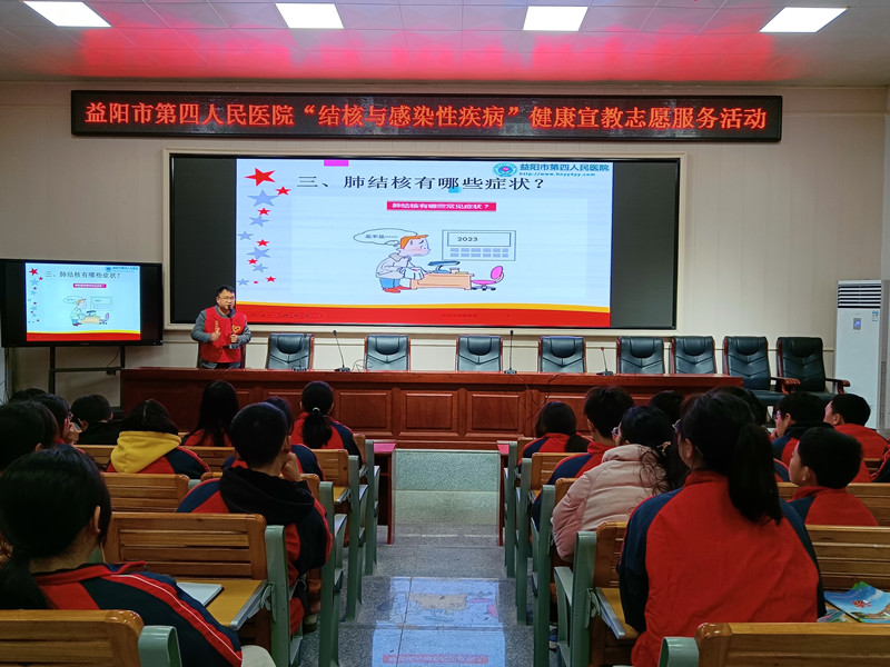 本网讯 3月21日下午,益阳市第四人民医院感染康复科副主任刘坤率队到清塘铺镇中学开展“结核与感染性疾病”健康宣教志愿服务活动。 肺病诊疗中心龙奇指出,结核病作为一种慢性呼吸道传染病,是长期以来严重危害我国人民群众健康的重大疾病之一,学生又是结核病发病的重点人群之一。他通过生动的模拟结核菌入侵细胞视频与贴近大众生活的真实案例,让在场师生对肺结核的传染源、相关症状、危险性及预防等知识有了更深入的了解,大大增强了传染病群防群控能力。刘坤则讲解了艾滋病的致病原因、传播途径、防治措施以及带来的危害等方面的知识,他告诉大家不要谈“艾”色变,更不要歧视艾滋病患者,只要同学们学会自我保护、洁身自好、正确预防,就一定能避免被感染。 聆听讲座后,同学们感受颇深:“这次活动的开展,让我们更多的了解和掌握了结核与感染性疾病的防治知识,真正有效地提高了自我保护意识。从我做起,才能让我们的校园永远健康,永远快乐!”