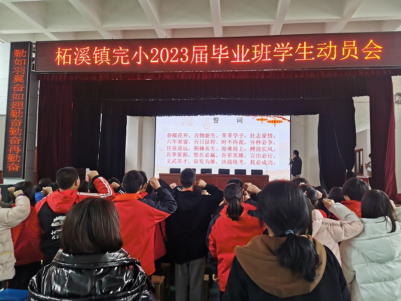 本网讯 3月22日下午,柘溪镇完小“行稳致远、筑梦未来”六年级毕业班学生动员大会在学校大礼堂召开。柘溪镇中心学校副校长宁辉、办公室主任仇一平参加动员大会,大会由完小教导主任杨丹主持。 会上,镇完小校长颜回肯定了毕业班教师辛勤的付出和孩子们取得的成绩,希望老师和学生都要树立必胜的信心,学校将尽一切所能支持毕业班工作。毕业班班主任代表龚顼以故事形式鼓励学生心中要有目标,行动才有动力。各科教师代表也发言为学生加油打气,希望孩子们能在后面的学习中加油努力,为自己小学生活画上圆满句号。 “吾拳紧握、言出必行、决战统考、我必成功......”响亮的口号展示了孩子们昂扬的斗志,激动地呐喊表达了孩子们共同的心声,政教主任谢呈云领誓,掀起了动员会的高潮。 宁辉对此次毕业班学生动员会进行了总结,并为孩子们提出了学习、安全、纪律上的要求和殷切的希望。