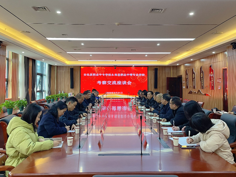 本网讯 3月21日下午,南县职业中等专业学校党总支书记、校长邓克芳一行到安化县职业中专学校(安化黑茶学校)考察交流,双方在该校致远楼304会议室举行座谈。学校党委书记、校长刘迪凡主持活动。 座谈会上,刘迪凡对邓克芳一行的来访表示欢迎,简要介绍了学校办学规模、技能培训、队伍建设、管理模式等基本情况,分享了汇聚资源,实施整体搬迁工程;对接产业、打造特色专业品牌;构建体系、促进学校内涵发展;统筹培训,发挥学校服务功能;擘画未来、规划学校发展蓝图等办学经验。提出了把学校建设成为“湖南省职业教育第一方阵、国家1000所优质中职学校之一、品牌特色鲜明的中职学校、中高职衔接的重要实施单位”的宏伟目标。 邓克芳对该校的热情接待和经验分享表示感谢。他认为安化县职业中专学校环境优美,布局合理,师资力量雄厚,设施设备齐全,服务功能强大,办学成绩优异。希望双方能够加强沟通、持续对接,为高质量推动益阳职业教育发展共同发力。随后,双方就教学管理、教育科研、实习实训、德育工作与校园文化建设等工作开展了一对一详细交流。
