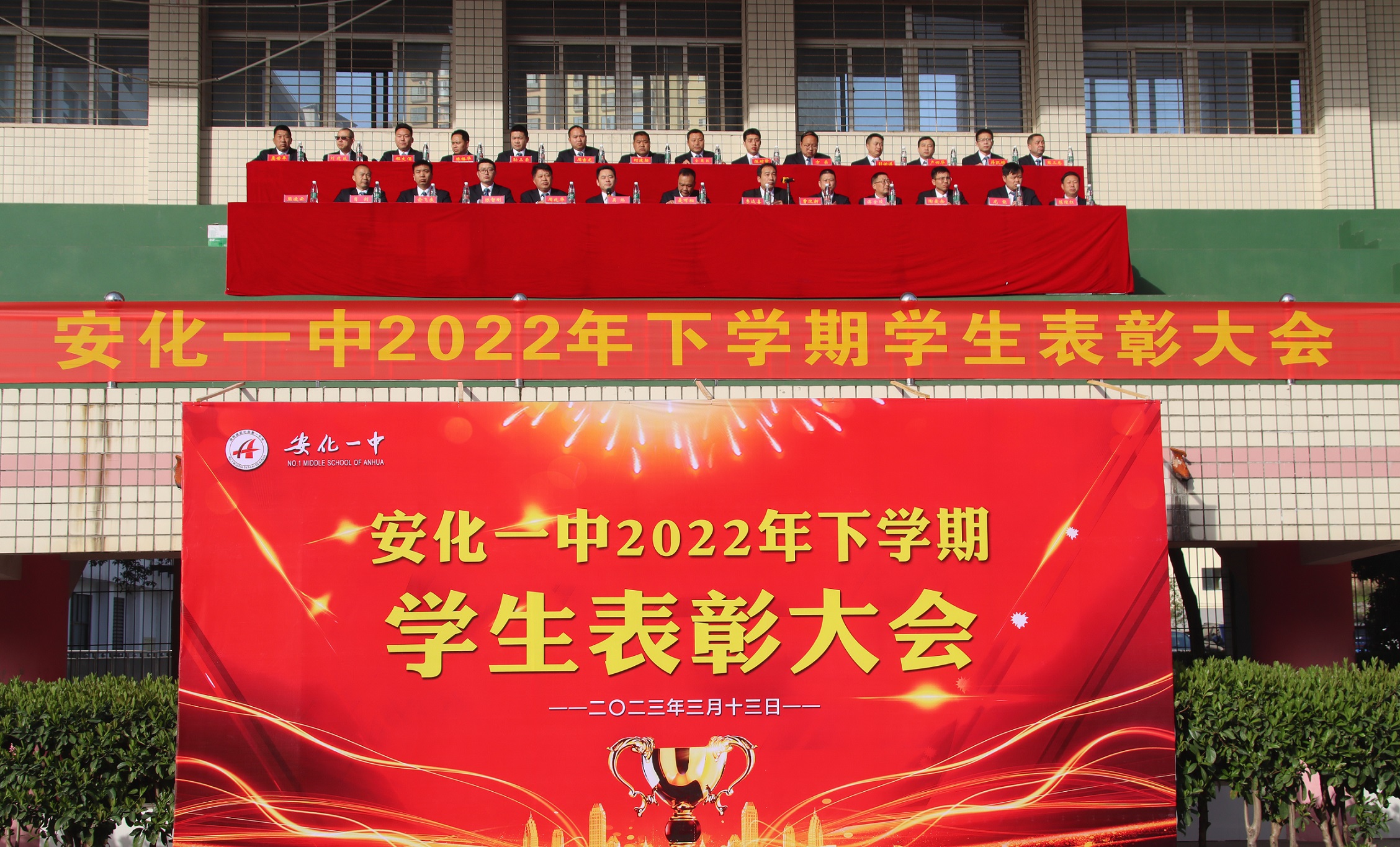 本网讯 3月12日,安化一中在田径运动场召开2022年下学期期末总结表彰大会,共有400多位同学受到表彰。本次表彰会由副校长吴炜主持。 随着国旗与校旗冉冉升起,总结表彰大会正式拉开帷幕。党委书记、校长聂可相对2022年下学期期末考试作简单总结。他表示优异成绩的取得离不开全校师生的共同努力,新的学期,全体师生要牢记“公、勇、诚、朴”的校训,继续发扬“奋发向上、努力拼搏、永不言弃”的“蜗牛精神”和“敢于拼搏、敢为人先、追求卓越”的崇文精神,胜不骄,败不馁,带着争创一流的信心与决心,迎接新的挑战。 副校长李远喜宣读2022年下学期学生表彰名单,并对获奖同学表示了热烈的祝贺。获奖同学分批次登台领奖并合影留念。