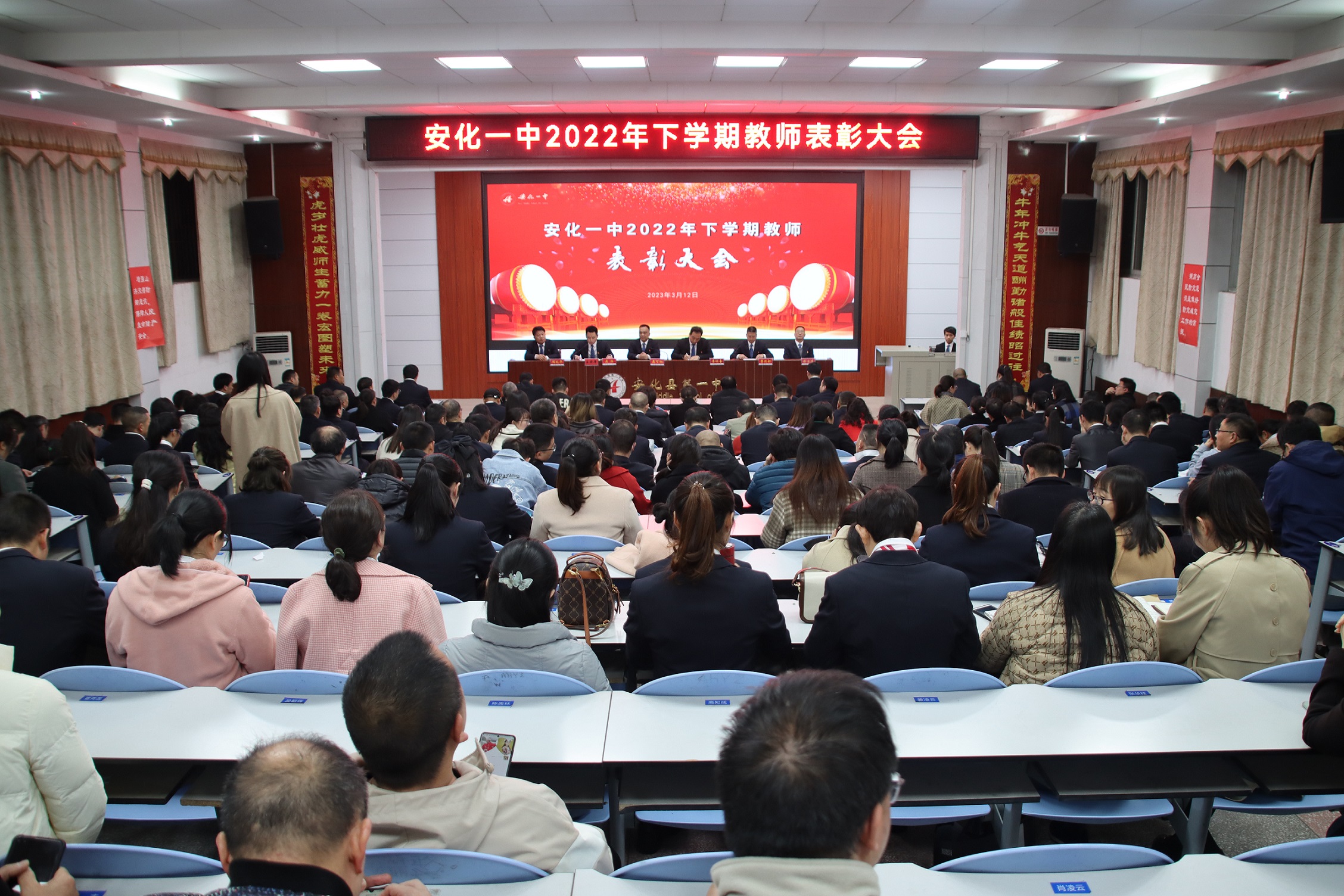 本网讯 3月12日,安化一中在培英楼多功能报告厅举行2022年下学期教师表彰大会。本次会议由副校长吴炜主持。 会议在庄重的国歌声中拉开帷幕。学校党委书记、校长聂可相充分肯定了老师们在2022年下学期取得的优异成绩,就提高教育教学质量提出了五项具体要求。他强调,各教研组要汇聚集体智慧,加强集体备课;走进名师工作室,在沟通中完善教研教法,将其与高考实际相结合;同时加强对年轻教师的培养与考核,通过教学比武等活动促进他们在实践中快速成长;另外还要不断深入钻研教材与学情,分学科建立行之有效的课堂模式,打造优质课堂;并不断加强课堂研究,通过“走出去引进来”的策略,进一步推动学校教育教学改革。他希望老师们不断更新教学理念,转变思维,努力提高课堂质量。 聂可相呼吁老师们团结协作,互相勉励,集思广益,共同营造安化一中温馨和谐大家庭,并以本次表彰大会为契机,再接再厉,敢于拼搏,奋起直追,争创一流。 副校长曹迎新宣布优秀教师表彰名单。受表彰教师上台领奖并合影留念。