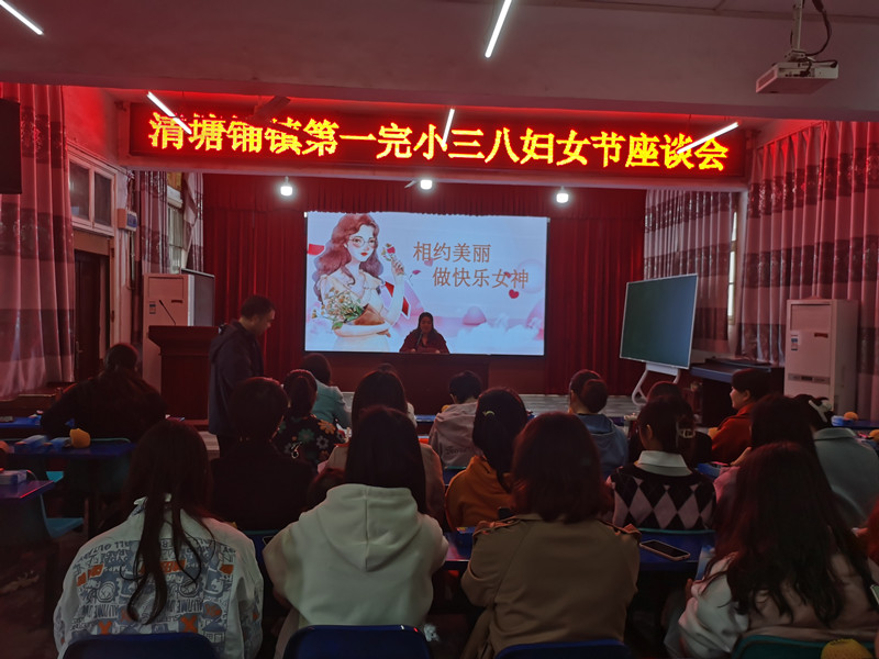 本网讯 3月8日下午,清塘铺镇第一完小组织全体女教职员工召开“相约美丽,做快乐女神”庆祝“三八妇女节”座谈会。 下午,全体女教职工齐聚学校多媒体教室,由学校工会主席王敏主持座谈会。他给女教职工献上了真诚的节日祝福,希望大家快乐工作、健康生活,如同这春风浩荡,阳光明媚。 该校校长刘小燕作了热情的洋溢的讲话,站在一个母亲、一个妻子、一个女儿的立场,从工作到生活与大家交流互动,老师们畅所欲言,感受到了清塘铺镇第一完小这个大家庭的温暖与关怀。会上,所有女同胞还收到了学校工会精心设计的小礼物,更是让大家开心快乐、笑颜如花。 会后,大家在食堂共进晚餐,一起谈笑风生,交流感情,女同胞们个个心花怒放、倍感幸福。
