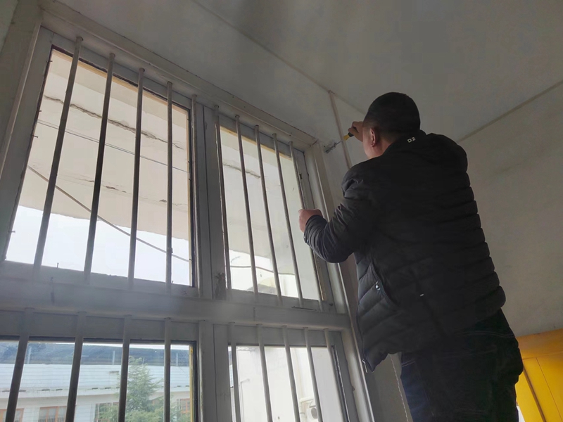 在维修过程中,两人分工合作,支梯子、扭螺丝、套窗帘,手磨出了血泡,腿钻心似的痛,但仍不言弃,一天下来,共维修窗帘70余幅。