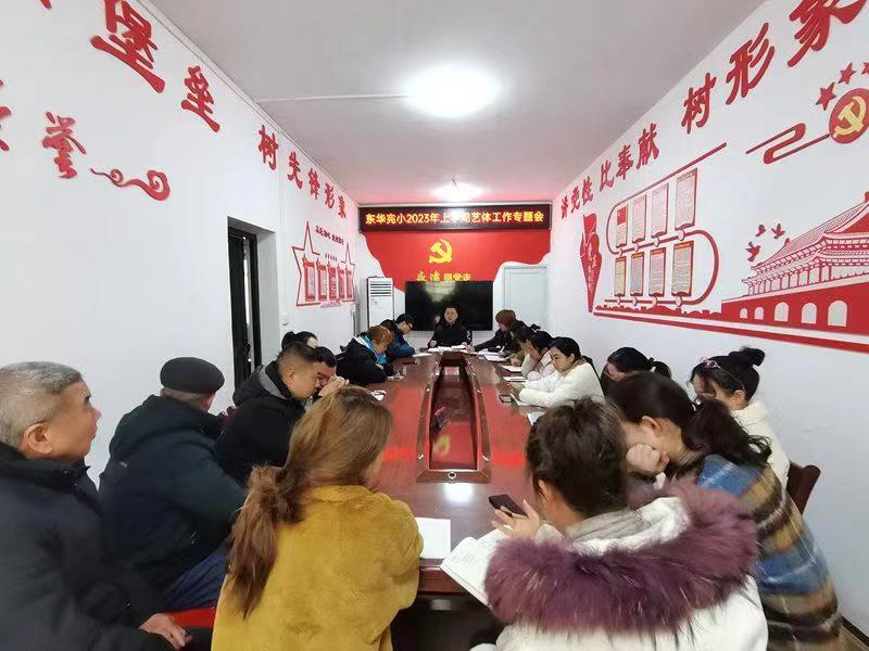 本网讯 2月24日 ,梅城镇东华完小艺体组全体教师齐聚会议室,召开2023年上学期艺体工作专题会。会议由校长王团主持,教导主任罗玉练主讲。 会上,罗玉练带领艺体组教师温习《湖南省义务教育课程实施办法》相关条例,并从共读艺体新课标、聚焦核心素养、立足课堂常规、引领学校发展四个方面提出确切要求。她指出:一是要将东华完小的红色底蕴及准军事化管理制度融入艺体课的教学设计和课堂实践中;二是将通过庆“六一”系列活动展示课后服务艺体社团的阶段性成果;三是艺体教师应立足课堂,增强学科育人功能,促进学生全面发展。 体育组教师代表喻正凡表示,艺体教学工作整改迫在眉睫、需常抓不懈。他简要分享从教以来的经验和思考,强调教学内容的选择、课堂教学的组织、教学评价等都要以学生为中心,促进“学、赛、练”有机结合。 王团对学校艺体课程教学现状进行态势分析,要求与会教师:平时扎实课堂教学,做好教育教学常规;充分挖掘教学资源,抓好课后服务工作;严把质量突破关,在总结中反思,在反思中提升。