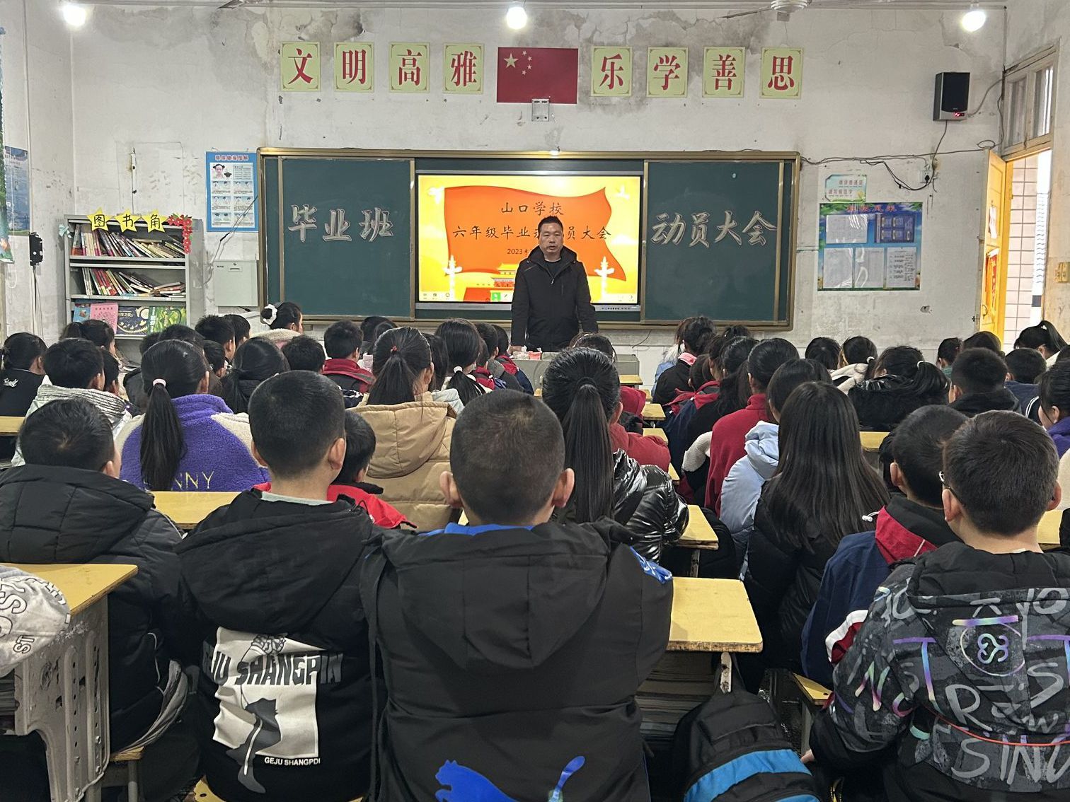 本网讯 2月22日下午,在教导主任方晓平的组织下,仙溪镇山口学校全体毕业班师生召开毕业班动员大会。 动员会上,六年级学生代表姚倩就如何利用时间、提高学习效率、保持良好心态等方面向同学们提供了一些经验和建议,鼓励同学们提前明确目标而为之奋斗;班主任龙艳荣深情寄语毕业班同学,鼓励大家树立信心,为自己人生的第一个转折点努力拼搏;方晓平从端正学习态度、养成良好的学习习惯、掌握复习方法等几个方面开出了“新路子”,校长杨力隆语重心长地给同学们讲述越王勾践等名人故事,激励同学们刻苦学习。 此次会议的召开,鼓舞了同学们的斗志,增强了同学们的信心,更明确了学习的目标。相信在七月份的小升初考试中,他们会用优异的成绩为自己的小学生活画上一个精彩的感叹号。