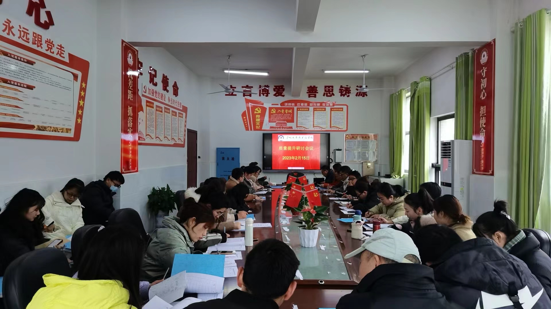 本网讯 2月15日上午,安化县思源实验学校在小会议室召开了质量提升研讨会议。教务处、教科室成员和各年级组长、教研组长、备课组长参加了会议。 会议由该校教科室副主任张乐主持。教务主任杨湘安分析了课堂教学现状,对组内研讨和日常工作检查提出了有针对性的建议与要求。教科室主任谢弯提出教师研修要做到“六个一”,教师个人能力要有提升,集体备课要形成教研合力,教育科研要有准备、多准备。 副校长王黎明对集体备课提出针对性建议,强调集备不能只是开学初昙花一现的应景之作,应该是常态化、长期性的日常表现,是学校校本教研的“家常饭”。 校长刘巩元在总结中提出“讲团结、讲奉献、讲引领、重实效”的提质策略,倡议以加强教研组的建设与发展为抓手,形成教研合力,营造求真、务实、自由、融洽的教研氛围,从而促进教师专业成长,促进教育教学质量的全面提升。