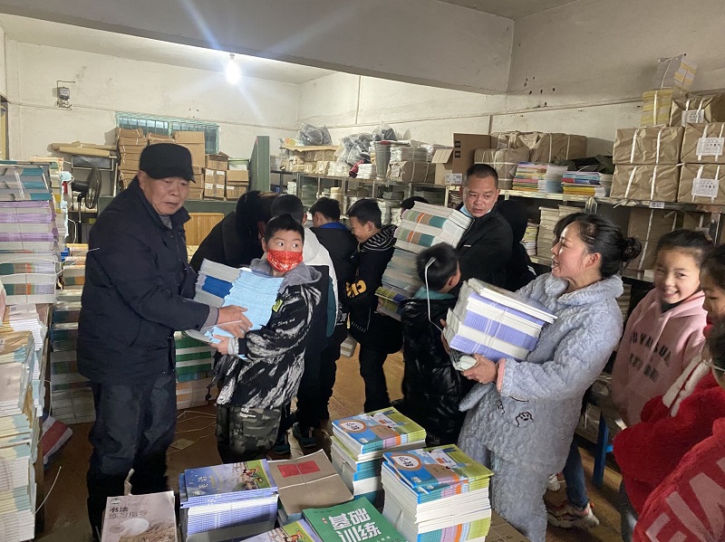 分书房内,责任老师带领学生和家长排好队有序领取教本与草本作业;