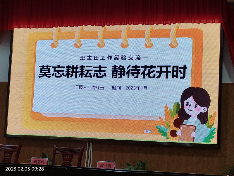 本网讯 2月3日上午,江英学校春季初中部开学工作会议暨寒假培训拉开序幕,初中部100余名教师按时参加。会议由学生处干事吴晨主持。 本次讲坛由青年新教师主讲。第一位登上《江英讲坛》的是新教师程思琦作成长分享。她以《未来不是要达到的地方,而是自己要创造的远方》为题,分享了自己班上经历过的三个小故事,三个故事独立成章,情节生动,指出深入了解学生个性心理,做细致的思想引导,多运用表扬与激励,让学生能真切感觉到老师的关爱,你就会看到孩子的进步。 第二个登台的是新教师周红玉作班主任经验分享。她从做一个“有备无患”的班主任;做一个“严而有度、爱而有方”的班主任;做一个“赏识人”的班主任;做一个“慧心巧思”的班主任四个方面介绍自己班主任的做法,有理论,更有具体动听的事例。“对学生的严格要求,就是对学生最大的尊重!一方面要‘严己’,一方面要‘严纪’。”“放大班级优点,给学生自信心;利用‘彩虹屁’,夸出内驱力”。“关注个性,适度引导;巧妙设计每一次谈话。”她分享的这些观点有深度,接地气,同样赢得了全场的热烈掌声! “今天的《江英讲坛》别开生面,给人振奋和欣慰!她俩是江英新教师中优秀的代表,我们为她俩的精彩发言再次用掌声表示感谢!”中学部校长戴思妹最后在小结时说。