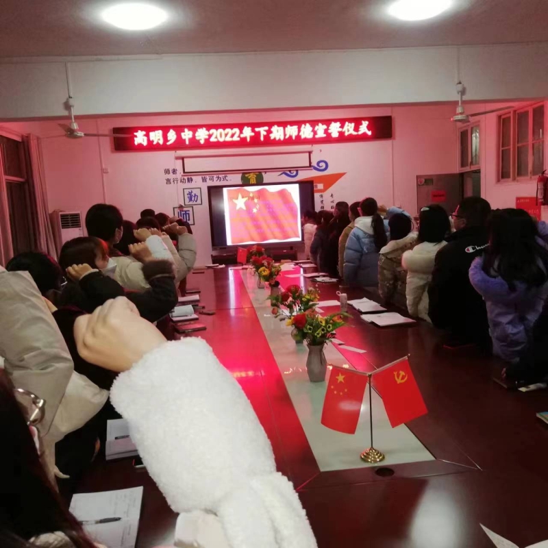 本网讯 12月22日晚,高明乡初级中学全体教职工在学校会议室,鲜艳的国旗下,庄严地举起右手,重温益阳市教师誓词,为教育事业表明心志。 晚上七点十五分,校长高飞跃领誓,全体教师举起右手,庄严宣誓:我是一名人民教师,面对国旗庄严宣誓:我将坚守讲坛,教书育人,关爱学生,把全部精力和满腔真情献给教育事业。争做有理想信念、有道德情操、有扎实学识、有仁爱之心的“四有”好老师。我将严谨治学,钻研业务,终身学习,努力提高教育教学本领。我将淡泊名利,为人师表,勇于创新,为社会文明进步奋斗终身! 宣誓结束后,高飞跃作了《守住教育初心,迎接各种挑战》的讲话。他强调,当今期末在即,年关将近,外地打工的、求学的纷纷回家,新冠等传染病肆虐,学生老师感染的概率很大,线上线下的教学同步进行,上级和群众的要求很多也很高,教学、卫生、防疫、考核、迎检等工作交织在一起,错综复杂,最是考验教师师德和职业操守的时候,大家一定要振作精神、迎难而上,以大局为重、急事为先、不忘教育初心,共克时艰,稳住教育阵地,确保教育质量。 老师们反映,通过宣誓等活动,铭记誓词内容,更加坚定了信念。将更认真地履职,责无旁贷地扛起教育大旗。(通讯员 龙腾安)
