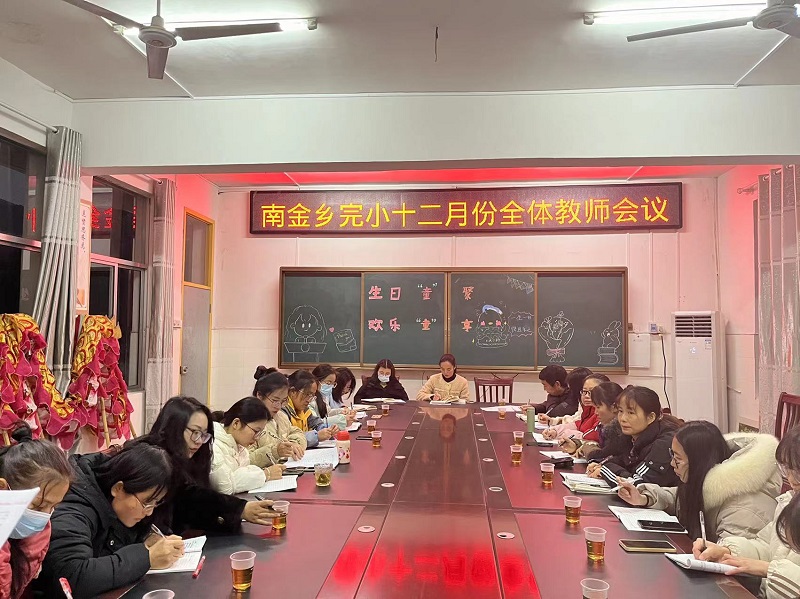本网讯 12月13日晚,南金乡完小组织召开十二月份全体教师会议。 会议在教师阅读分享中拉开帷幕,何婷为老师们分享《窗边的小豆豆》,告诉老师们如何用正确的方式和态度来教育孩子;校长夏晶则带来《一个很小很小的小孩》,勉励老师们用心发掘孩子们身上值得肯定的地方并予以赞赏和鼓励,让孩子们变得更加自信。 学校各行政对上月工作做以简单总结,并对下阶段工作做出部署安排。夏晶就期末复习阶段提出具体要求,一是严抓疫情防控,做到不放松、不扎堆、不恐慌;二是严把质量关,分析试卷抓考点、以本为本不超纲、题型训练重过关、做好培优辅潜不放弃、抱团取暖增信心。 此次会议,指明了老师们今后需要努力的方向。在最后三周时间里,齐抓共管,重视教学方法,教师要学会反思,要实干巧干,在学期最关键的时刻咬紧牙关!千淘万沥虽辛苦,吹尽狂沙始到金!