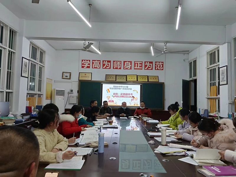本网讯 近日,南金乡中学召开九年级毕业班研讨会。会议由南金乡中学校长谌少准主持,南金乡中心学校校长邓明华、副校长李飞翔和全体九年级教师及八年级班主任生-地老师参加。 会上,教务处主任夏优娟向大家分析了上一届九年级的中考成绩及本届九年级生物地理成绩,也为明年的毕业考试提出了希望和要求。各班班主任分析本班成绩及对本班学生的现状而采取的举措。由各学科任课教师发言并制定各自的中考目标。 南金乡中心校副校长李飞翔对本届初三教学工作提出几点建议和要求:要有分阶段实施的计划、计划要精准落实、注重课堂效率。 南金乡中心学校校长邓明华对这次会议进行了总结与分析,并对全体九年级教师提出了他的要求,同时提出对毕业考试的目标与要求并提出了,认清形势、充满信心、找准方法三个方向。