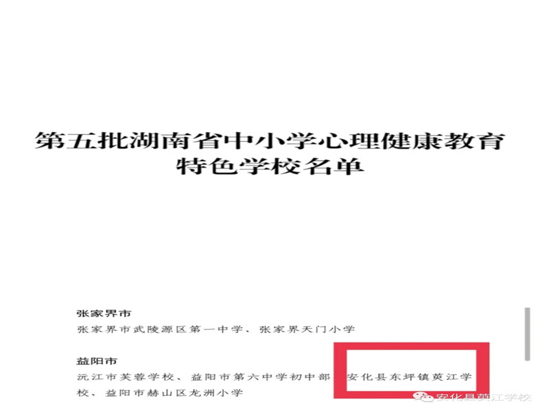 据悉,此次评选工作,是为了指导中小学心理健康教育特色学校进一步完善心育体系建设,高标准推进区域内心理健康教育工作,进一步总结经验、凝练特色,深入抓好心理健康教育,切实发挥辐射示范作用,以点带面推动全省心理健康教育高质量发展。此次公布的名单中,全省共49所,益阳市4所,而安化仅有萸江学校一所学校。