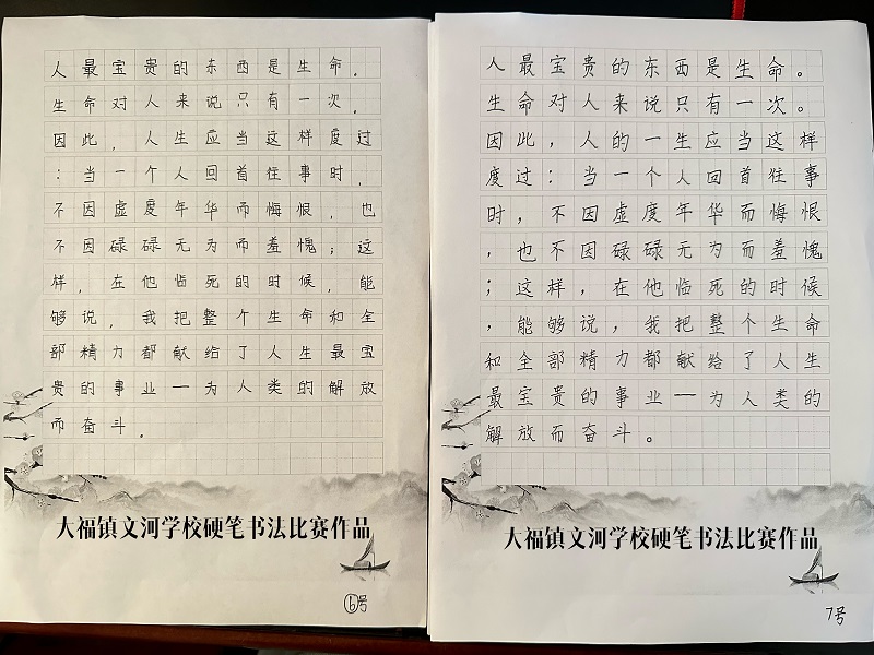 本网讯 11月11日,大福镇文河学校举行了硬笔书法比赛。此次硬笔书法比赛旨在纠正学生不正确的握笔方法与写字姿势,进一步培养、激发学生的练字兴趣,使学生养成良好的书写习惯。 本次比赛采取现场书写形式,统一使用中性笔并规定了书写内容。比赛现场,参赛者们个个满怀信心,用心书写每一个笔画、每一个汉字。同学们握笔正确,坐姿端正,表现出良好的书写习惯,所写作品笔画流畅,结构匀称,整体美观。 下午,由学校校长室、教导处、教师代表组成的评委团,对作品进行了认真的评比。评委老师们从书写笔画笔顺和卷面等方面综合评估学生的写字水平。在公平、公正的评分之后 ,优秀作品将在校园内进行展览。 通过这次比赛,增强了学生们对汉字的热爱,进一步弘扬了中华传统文化,提高了学生们的综合素质。