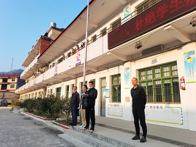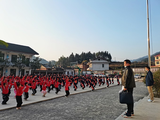 本网讯 11月9日,县教育局基教股陈方元、陶智咏、刘日光到东山完小现场裁评全县大课间操比赛赛况。 早晨7:40,大课间操比赛正式开始。广播铃声一响,东山完小全体学生整装待发,排着队井然有序地走进操场。伴着口号,全体学生开始跑操,步伐矫健有力,排列整齐。领操员认真负责并及时控制跑操速度。在跑操结束时,按正确路线归队,及时整理队伍准备做广播操。广播操动作干净利落,展现出了各班昂扬的斗志和蓬勃的朝气。在123班周妙沩同学的领诵下,全体学生一起朗诵《少年中国说》,富有气势,振奋人心。展现了东山完小学子们自信、自强的蓬勃风貌,鼓励学生们肩负起建设少年中国的重任。