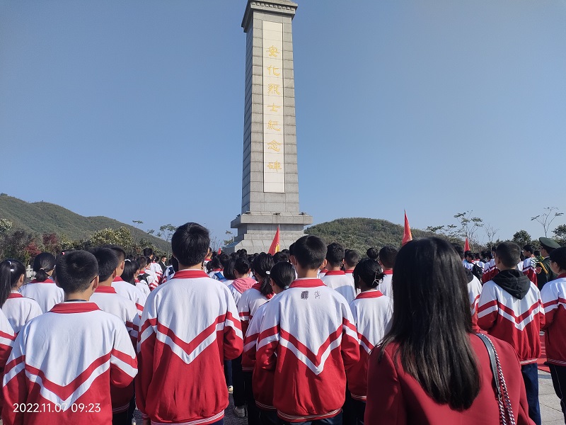 本网讯 11月6日至8日,江英学校分三批次组织全校3000多名师生到安化云台茶旅集团开展德育研修活动。 八年级的200多名师生最先到达英雄公园,大家怀着无比崇敬的心情,拾级而上,手持金色的小黄花,列队来到安化英烈纪念碑前的大平台,举行了庄重的凭吊仪式。两名英姿威武的礼兵,走着正步向纪念碑敬献了花圈,两名身着校服同学代表江英学校的全体师生向英烈敬献了花圈。全体人员静默三分钟,行三鞠躬礼以示凭吊;司仪员简介了安化革命英烈的英雄事迹,勉励同学们学习英雄品质,发扬革命传统,珍惜当下时光,勤奋刻苦学习,立志报效祖国。全体师生向革命先烈敬献了鲜花,并绕纪念碑一圈后结束了凭吊仪式。 据悉,安化云台山不仅是湖南省4A级风景区,环境秀美,资源丰富,大叶茶享誉九州,而且这里曾是当年红军战斗过的地方,到处留有革命英雄的足迹。