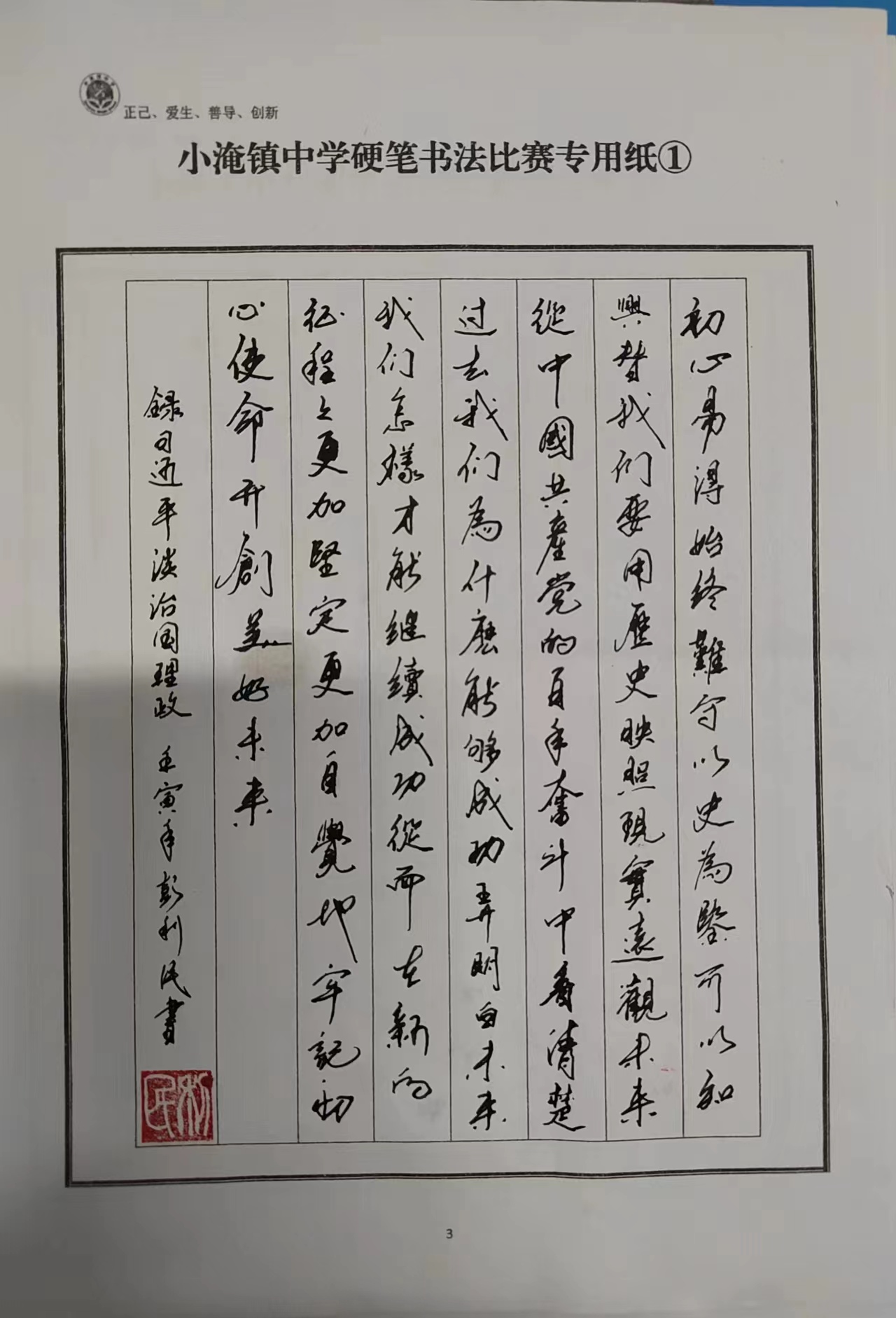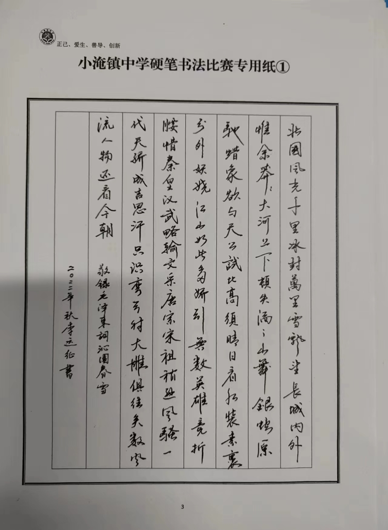 本网讯 11月4日,小淹镇中学教职工硬笔书法比赛结果揭晓,共评出九个一等奖。值得称赞的是,食堂主管彭利民同志的作品深受评委们好评,获本次比赛一等奖。为了打造书香校园,促进全校教师自觉加强基本功训练,提高教师自身素质,促进教师专业成长,提高教师综合素养,丰富课余生活,展示学校教师风采,小淹镇中学在十月底至十一月初举办教职工硬笔书法比赛。广大教职工积极响应,共有57人上交了作品,参与率超百分之九十。