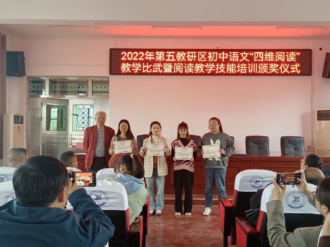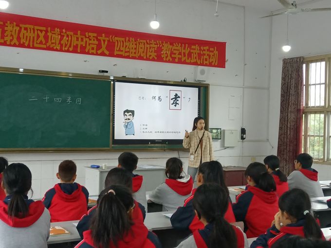 本网讯 10月28日,第五教研区初中语文“四维阅读”教学比武暨阅读教学技能培训活动在江南镇中学举行。第五教研区各乡镇中心校分管教学的校长和教务主任、各乡镇中学语文教研组组长及部分语文教师参加了此次活动。 江南镇中学教师符小娟以师生跟着旋律齐唱《好汉歌》,导入课题《识好汉,品“义味”--〈水浒传〉名著导读》,拉开了活动序幕。符小娟以玩游戏、填图表、谈感受等方式,引导学生读绰号、读武器、读外貌、读情节等,品悟“好汉”的“义”味。滔溪镇中学张莉萍老师以名著《水浒传》为例,从读书名、观导读、知概况;到读细节、多解读、析人物;再到读回目、找异同、知特色,步步深入,层层递进,解析名著阅读方法。田庄乡中学教师佘玉玲用“跳读”和“精读”两种方法,引导学生阅读《西游记》。小淹镇中学熊向前老师选用《二十四孝图》,指导学生阅读鲁迅著作《朝花夕拾》,通过“孝”的演变、含义、故事等,阐释“孝”的真正意义,增强学生的文化自信。四位选手激情满怀,其新颖的教学设计、生动形象的语言、别致的阅读技巧,深深地吸引着学生,课堂气氛非常活跃。师生同读一本“名著”,同享读书的方法、乐趣与收获,将阅读的种子根植于学生心田。 江南镇中学副校长陶佳红就四堂课分别进行了点评,并对“名著导读”的教学评价与效果测评提出了自己的看法:要充分发挥名著导读中“导”的作用,探索多样的教学形式,激发学生的阅读兴趣,提升阅读效果;合理运用标准化测评、表现性测评、过程性测评,探寻多元而开放的阅读评价方法,以达到诊断和激励的作用。 符小娟、熊向前获得一等奖,张莉萍、佘玉玲获二等奖。江南镇中心学校副校长李新民为获奖者颁奖,勉励老师们加强阅读,提升综合素养,涌现出更多的优秀语文教师。