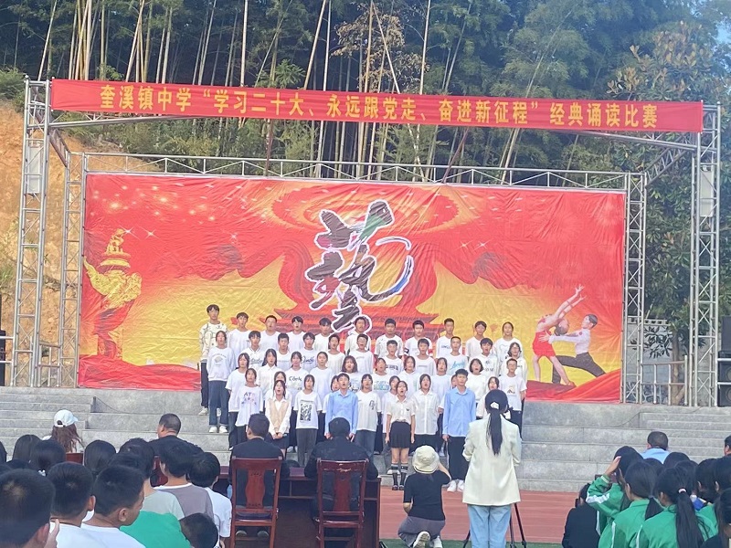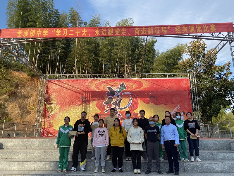 本网讯 10月20日下午,奎溪镇中学团支部在学校大操场举行了经典诵读比赛。 该校十个班级以抽签的形式,分别轮流上台举行了经典诵读比赛表演。有的班级激情洋溢地诵读了毛泽东的诗词《沁园春 雪》,有的班级满腔热血地朗诵了岳飞的《满江红》,有的班级充满激情地诵读了梁启超的《少年中国说》。同学们以这种诵读经典作品的形式,抒发了对党、对祖国和人民的热爱之情。经过校委会组成的评委评定,98班、107班、99班夺得本次经典诵读比赛活动一等奖。 该校副校长兼教导主任胡永军指出了举行这次活动的意义,要求全体师生以学习党的二十大精神为契机,结合诵读经典作品,更加深入地开展爱党爱国教育活动,该校校长周飞霄、学校党支部书记邓成才分别给获奖班级进行了颁奖表彰。