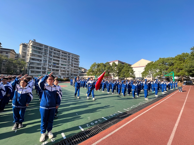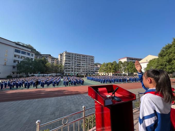 本网讯 10月13日,东坪镇中学在大操场举行“争做新时代好队员”少先队建队仪式。该校党支部书记、校长刘志慧,副校长谢立贤、刘卫安及七年级全体少先队员近900人参加。
