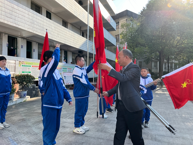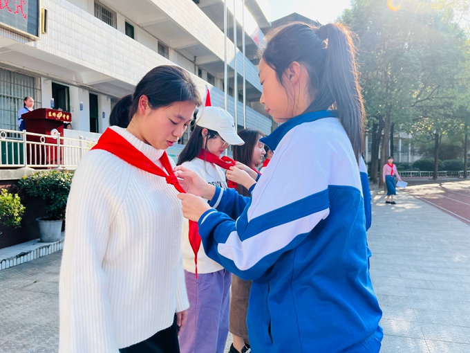 在《中国少年先锋队队歌》中,仪式正式开始。刘志慧宣布成立七年级中队,聘任刘素娟同志为大队辅导员,李跃红、张建春等16位同志为中队辅导员。刘卫安为各中队授予中队旗,优秀少先队员代表给各中队辅导员佩戴红领巾。谢立贤为获得“红领巾奖章”二星章的优秀少先队员颁奖,并鼓励少先队员们热爱祖国,热爱学习,努力向团组织靠拢。