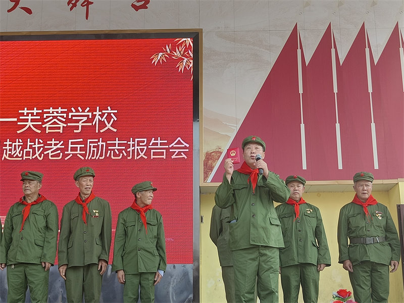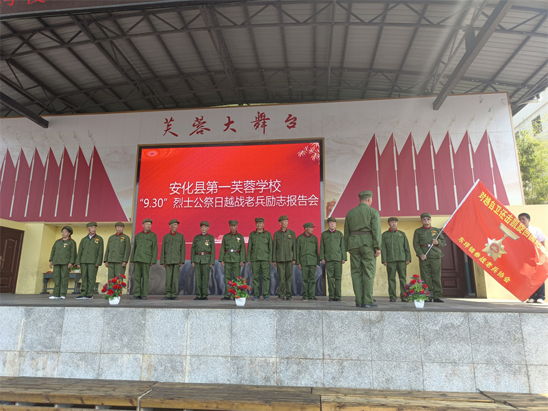 本网讯 9月26至9月30日,安化县第一芙蓉学校举行了“9.30”烈士纪念日系列活动。 升旗仪式上,学生代表以“国庆勿忘祭先烈”为主题进行了国旗下讲话;校园广播电视台播放了《缅怀革命先烈、弘扬民族精神——段德昌烈士事迹》专题纪录片并对全体师生进行了红色精神宣讲,让校园布满着浓烈的红色气息。 9月30日下午,全校师生2200余人齐聚学校大操场,东坪镇退伍军人服务站站长李全球带领14名越战老兵来到学校,举行了“9.30”烈士公祭日越战老兵励志报告会。 会上,少先队员向越战老兵献上红领巾,两名越战老兵分享了自己的红色故事,李全球针对老兵发言进行了总结,他指出:对越自卫反击战全体老兵以战争亲历者、历史见证人的身份向第一芙蓉学校师生做了一次很好的党史学习教育,作为学生我们要好好学习,为社会发展作出积极贡献,将来成为祖国的栋梁。