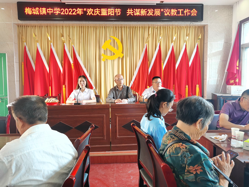 本网讯 9月30日,梅城镇中学退休教师在学校党员活动室举行了2022年“欢庆重阳节,共谋新发展” 议教工作会,会议由该校工会主席胡盛云主持。 校长喻选民代表学校向全体退休教师致以节日的问候,高度肯定了他们为学校发展做出的积极贡献。他表示,近年来,学校发展迈上新台阶,各方面取得了可喜的成绩,这些发展是建立在一代又一代的老师的智慧之上,与各位老教师们深耕与奉献息息相关。希望老教师们不忘初心,一如既往地支持关注学校的建设与发展,积极为学校的发展建言献策,共同推动学校全方面高质量发展。学校将始终如一地关心老同志,全力帮助老同志解决遇到的困难,支持老同志持续发挥余热,携手共建梅城镇中学发展的美好明天。退休协会负责人陈明和向各位老教师通报了退休教师协会工作情况,并就开展的有关活动等进行了说明。 座谈会上,退休教师畅所欲言,感谢学校对他们的关心,对学校取得的成绩给予了高度赞扬,对领导班子的工作作风和工作实绩表示充分肯定,表示会一如既往地关心支持学校的建设与发展,并对学校今后的教育教学工作提出了宝贵建议。