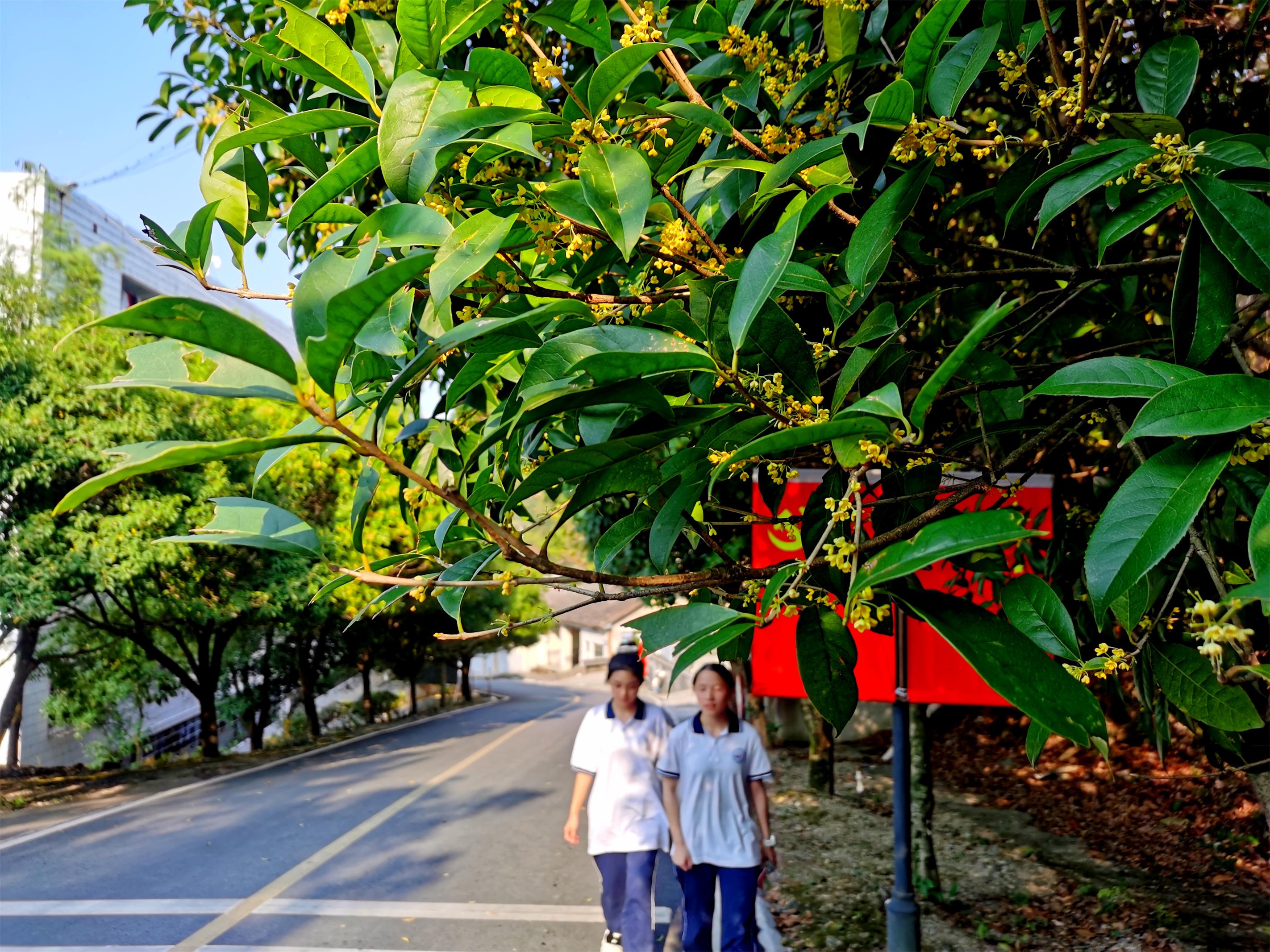 本网讯 9月29日,四中校园迎来了桂花大面积盛开。在校园主干道、中心花园、学生公寓区里,近百棵金桂、银桂、丹桂、四季桂等桂花品种竞相绽放,沉甸甸地盈满枝头,桂香弥漫在校园的各个角落,沁人心脾。今年受天气影响,四中校园桂花大面积盛开的时间推迟了20天左右,许多学生在课余时间走出教室散步赏桂,沉浸在扑鼻而来的花香中。 据悉,该校于2020年恢复普高办学后,在优秀校友、荣誉校长、湖南大学环境艺术学博士生导师陈飞虎教授的指导下,按绿植花期调整校园绿化规划、扩大绿化面积,将党建文化和校园文化深度融合,校园文化品位得到进一步提升。(通讯员:刘春晖) |