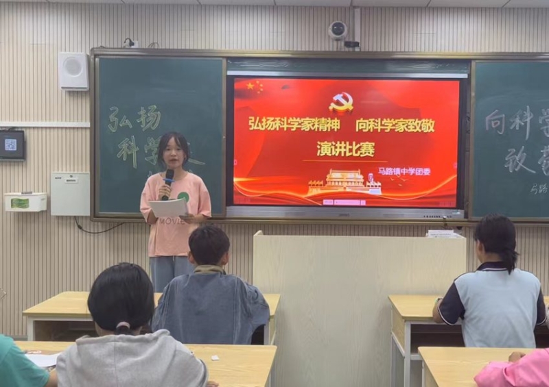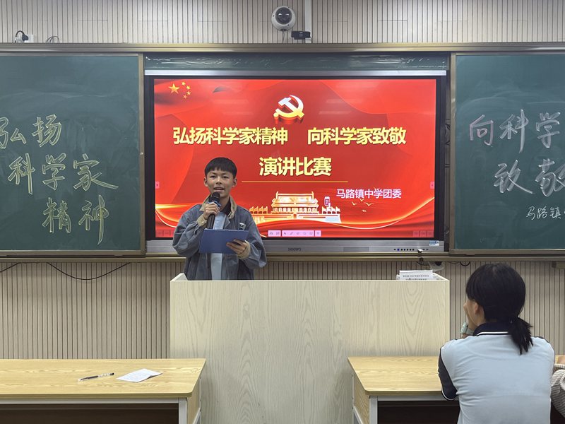 本网讯 9月27日,马路镇中学开展了“弘扬科学家精神,向科学家致敬”主题演讲比赛。 参赛选手们用激昂的语言,充沛的感情,表达了对科学家们的崇拜与敬意,同时也充分地展现了他们的才能,演讲内容观点鲜明,立意深刻,语言表达自然流畅,声情并茂;举止大方得体,表情自然真切,与观众眼神互动,赢得了评委老师和现场观众的热烈掌声。 此次活动主题突出,意义深远。用演讲的形式将科学家的精神贯彻深入人心,为落实习近平总书记在科学家座谈会上提出的“大力弘扬科学家精神”的重要指示,扎实推进科学教育,树立成长典范,服务人民的爱国精神起到了促进作用。