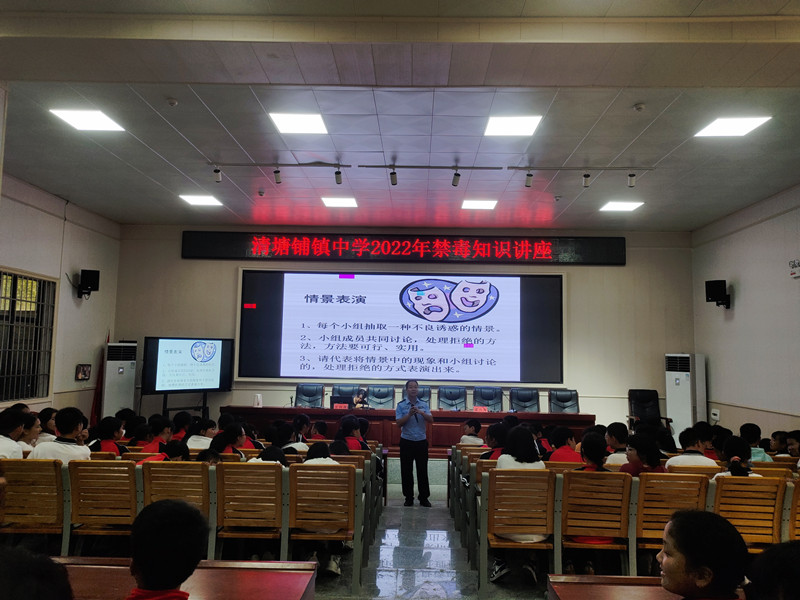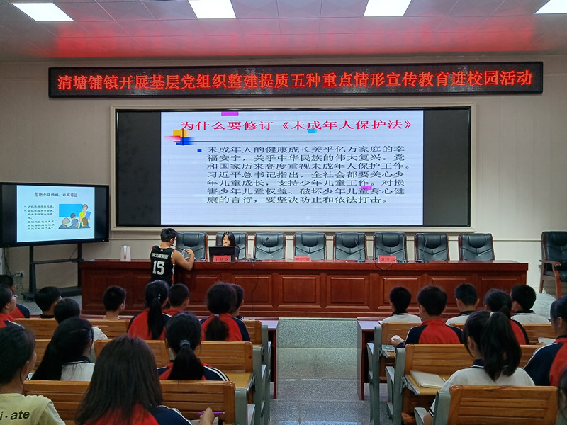 本网讯 9月27日下午,清塘铺镇人民政府在中学多功能报告厅开展基层党组织整建提质五种重点情形宣传教育进校园活动。 活动中,清塘铺镇派出所所长谭新华以“青春与健康”为题进行了禁毒防毒知识讲座,他运用PPT向在座师生介绍了常见毒品的种类、吸食毒品的危害、如何防范毒品等,并通过详实的案例让青年学生认识到了毒品对社会、对家庭、对个人产生的严重危害,增强了学生识毒、防毒、拒毒的意识,使他们远离毒品。 司法所律师廖漫洋讲授未成年人保护及安全防护知识。她以未成年人的定义和范围、未成年人遭受的主要侵害、谁来保护未成年人、未成年人保护法的亮点为主要内容,结合当下热点,就防电信网络诈骗、防性侵、防非法宗教、防校园欺凌等给同学们作了详细的讲解与指导。她建议每一位同学都要珍爱生命,培养良好的生活态度与生活习惯,提升自我防范意识和保护能力,健康、自由、快乐成长。